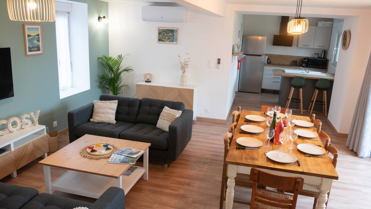 Simplifiez-vous la vie dans ce logement paisible et central. Maison rénovée dans un esprit Cyclades comme un cocon lumineux. Grande pièce de vie de 30 m2 avec salon séjour cuisine donnant sur une terrasse pour les repas ensoleillés. Un poêle complète cette pièce pour réchauffer les quelques jours pluvieux qui ne durent jamais. A l’étage un petit escalier désert 2 chambres avec au centre une salle de bain douche. 1 chambre parentale lit 160x200 1 chambre d’enfants 2 lit de 90x200. La sérénité..