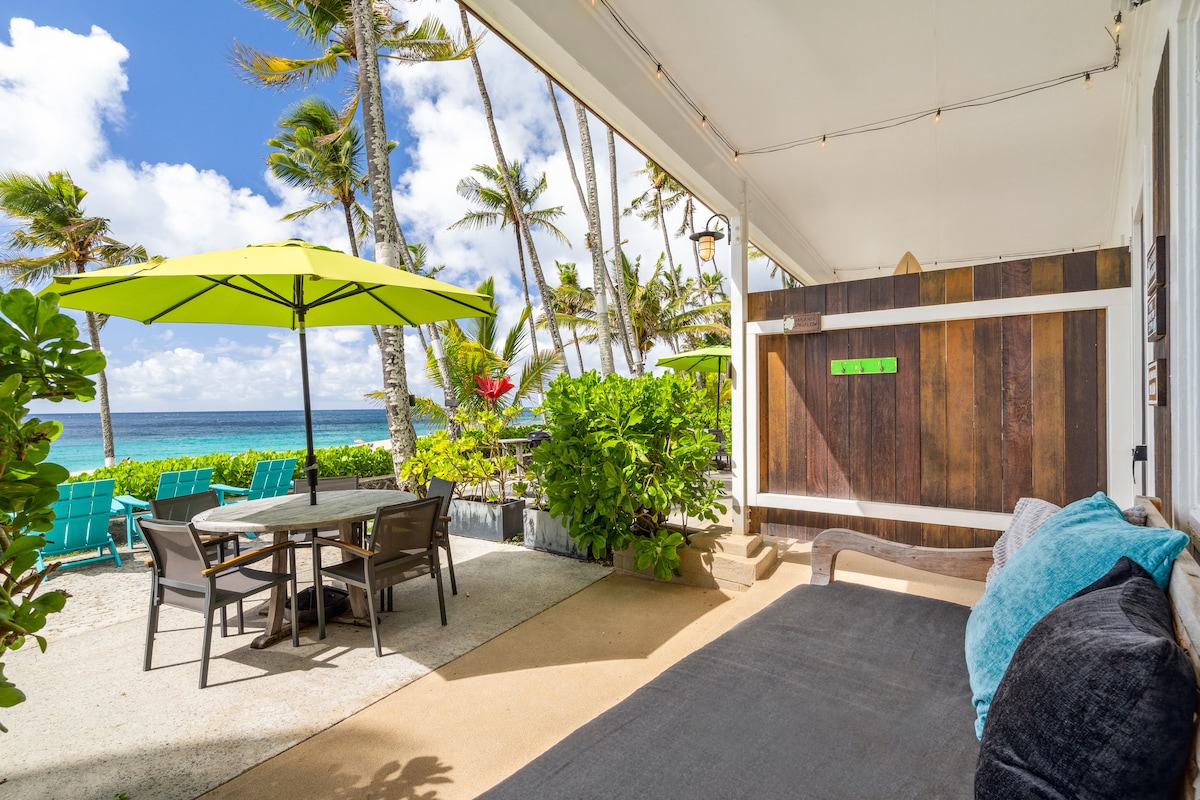 Bungalows frente a la playa en la icónica costa norte de Oahu. Los huéspedes disfrutan de románticas puestas de sol en un acre y medio de playa bordeada de palmeras con vistas a la increíble playa de Ke Iki. Todos nuestros bungalows frente a la playa han sido completamente remodelados y todos cuentan con hermosas vistas al mar y al atardecer. Los legendarios "Ke Iki Beach Bungalows" han estado operando con Aloha desde 1952, búsquenos en línea para leer nuestras excelentes reseñas. NOVEDAD: acompáñanos en nuestras clases diarias de yoga gratuitas en nuestra terraza de yoga al aire libre + sauna y bañera de inmersión en agua fría.