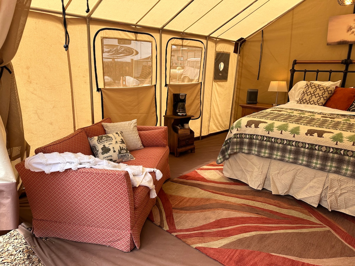 ¡Pequeño campamento de glamping en una granja rural con muchos árboles y mucho espacio personal! A diez minutos de tiendas, restaurantes y otras comodidades. Lo suficientemente cerca de la ciudad para mayor comodidad, lo suficientemente lejos como para descansar y relajarse. Hay animales alrededor, así que pregunta con anticipación sobre cualquier alergia o consideración especial para que tengas una buena experiencia.