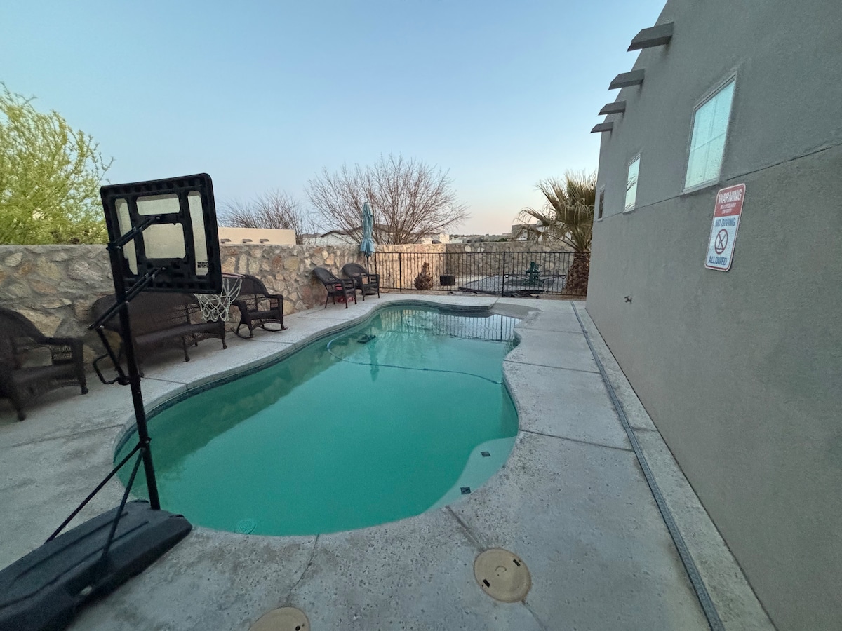 El paraíso del desierto está a pocos minutos de los restaurantes, tiendas y grandes almacenes. La casa está al lado de un increíble sendero para caminar/correr. El patio trasero está preparado para el entretenimiento: patio cubierto, TV al aire libre de 75 pulgadas y un conjunto de patio acolchado. Con actividades divertidas como piscina, corn hole y voleibol de piscina. La cocina exterior con parrilla tiene vistas al hermoso cielo de Nuevo México. La casa también cuenta con un espacio de oficina totalmente dedicado, con un escritorio y un sofá, perfecto para realizar cualquier trabajo.