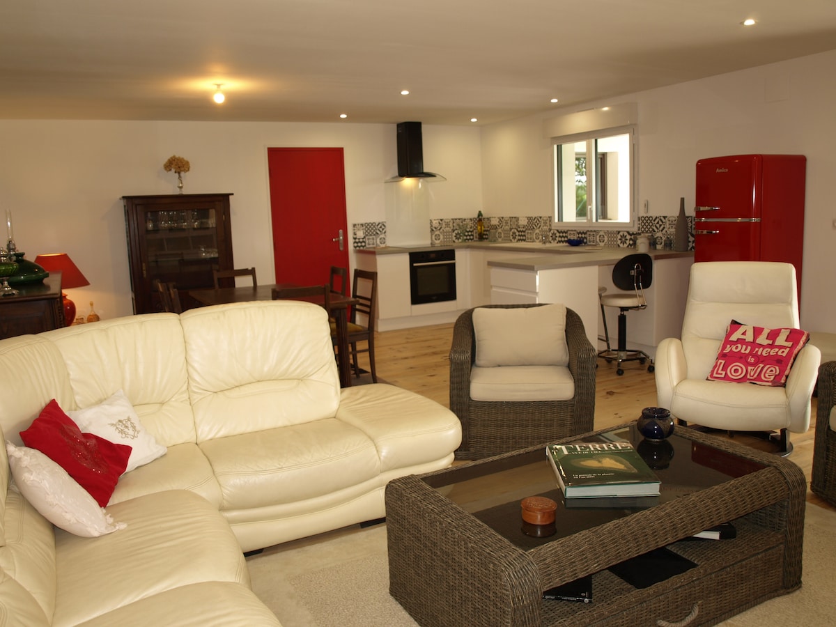 Ancien entrepôt de 65m2 habitables dans le centre historique d’Auch accessible par une pousterle. Logement indépendant doté d'une chambre (lit double) et d'une mezzanine basse (deux lits simples). Idéal pour un couple et deux enfants. Très grande terrasse sous glycine avec buanderie vitrée attenante. Accès au jardin (1500 m2 arborés) et à ses équipements depuis la terrasse. Equipements : plancha, parasols, piscinette gonflable, vélos, table de ping-pong, chaises longues, etc.