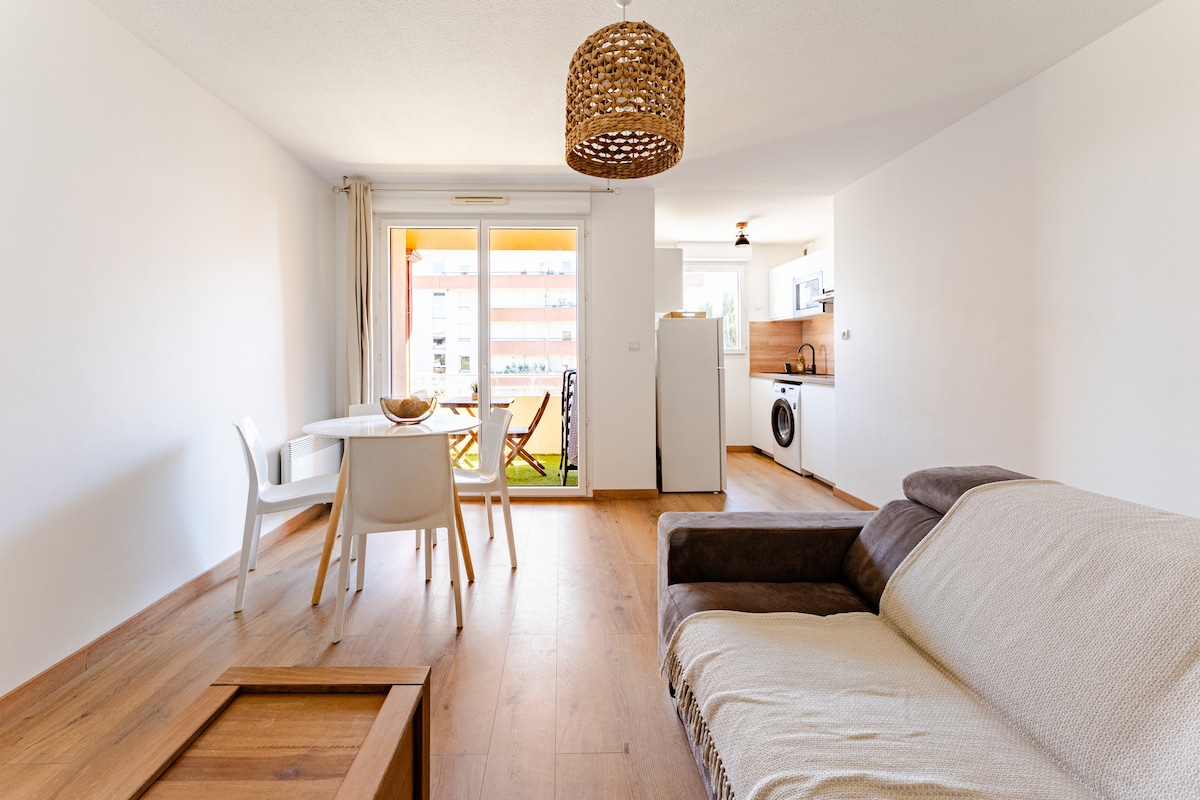 ✨ Elegante apartamento tranquilo y luminoso en Purpan, Toulouse. Remanso de paz al pie del tranvía Ancely, con aire acondicionado, terraza y estacionamiento privado. 📍 Cerca de los hospitales Purpan, Pierre Paul Riquet, Blagnac AIRBUS/ATR y restaurantes y comercios ✔ 1 espacio de estacionamiento privado ✔ Estadía ideal en pareja o viaje de negocios ✔ Aire acondicionado y terraza ✔ Llegada 100% autónoma 📲 Folleto de bienvenida digital con todas nuestras buenas direcciones ❤️ ¡Agregue el anuncio a sus favoritos!
