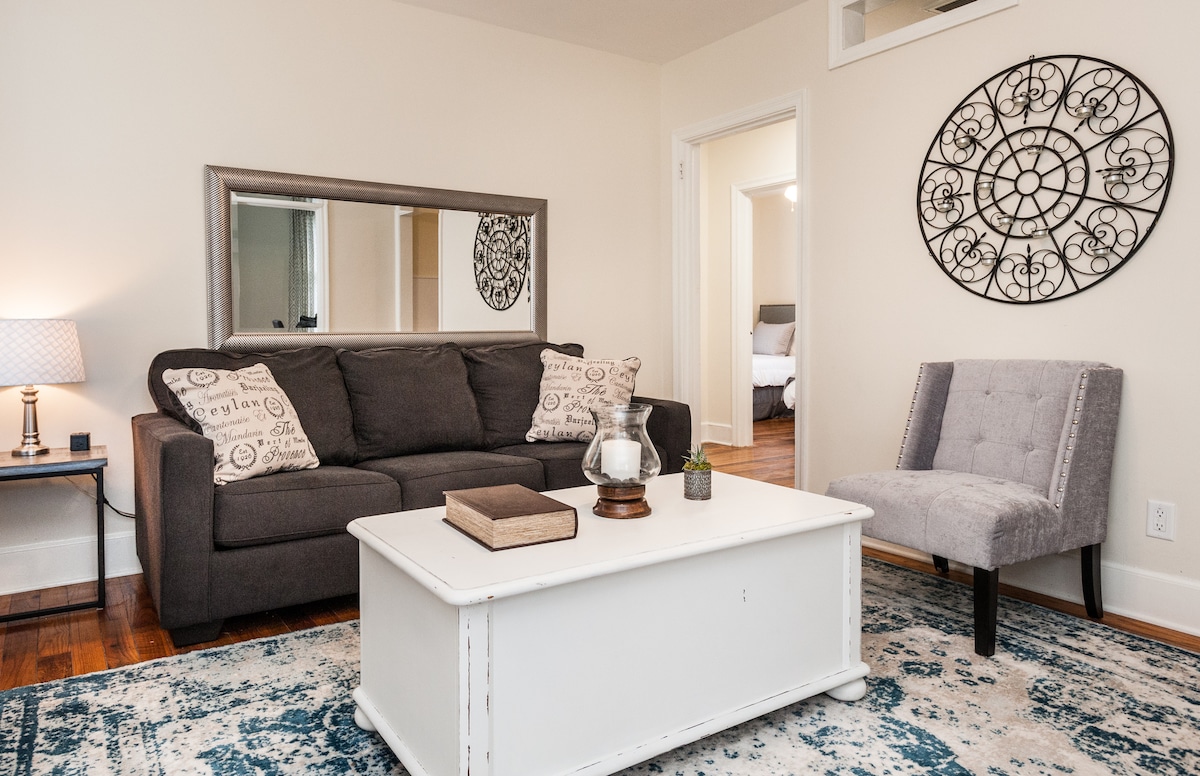 (Consulta también "The Harrington" para el condominio de arriba). Este departamento en la planta baja cuenta con todo lo que necesitas para una acogedora escapada a Beaufort. Tanto moderno como histórico, está ubicado en el corazón del barrio Northwest Quadrant, en el distrito histórico transitable. El apartamento de 500 pies cuadrados con techos de 10 pies, grandes ventanales, paredes marinas oscuras, pisos de hormigón y muebles elegantes es audaz y guapo. Usando el Breville barista pro, prepárate un café con leche para disfrutar en el hermoso porche delantero y relajarte.