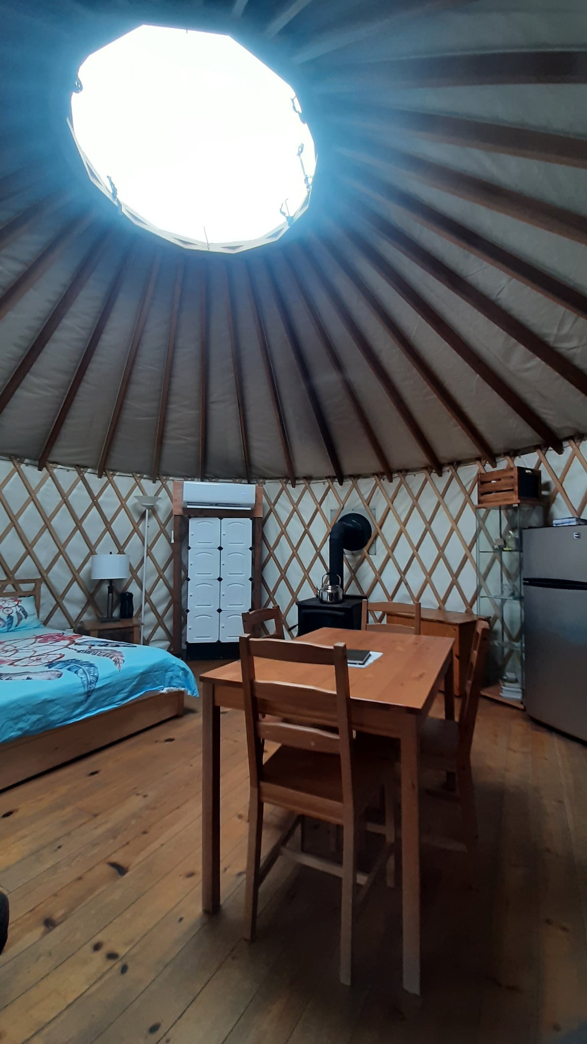 Our Yurta Yurt, inspired by indigenous Central and East Asian homes, boasts a spacious 600 square feet deck with breathtaking mountain views. Featuring a modern wood-burning stove for year-round comfort, Japanese influences add elegance to the clean design. Made of white ash wood, this yurt feels airy yet warm, insulated with real wool. Large windows connect the circular space to nature, while a sky window tracks sun and stars for a truly immersive experience.