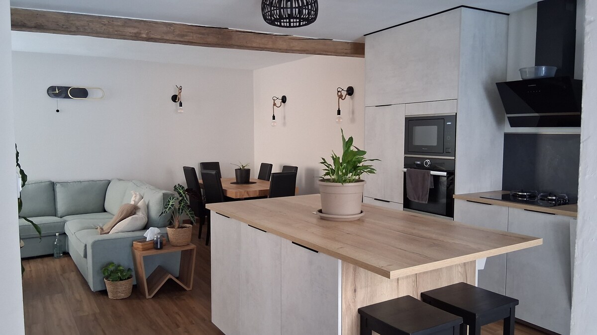 Este apartamento se encuentra en una gran casa de viñedos del siglo XIX (ocupo con mis hijos la parte trasera del edificio). Este alojamiento es ideal para una pareja o una pareja con bebé (cuna en el lugar), ¡aunque puede alojar a 4 personas por un corto tiempo desplegando el sofá! La superficie es de 45 m2 con su terraza privada de 6 m2. Podrás acceder al exterior y al jacuzzi (spa) de 3 plazas (abierto de abril a octubre). La llegada es autónoma (caja de llaves).