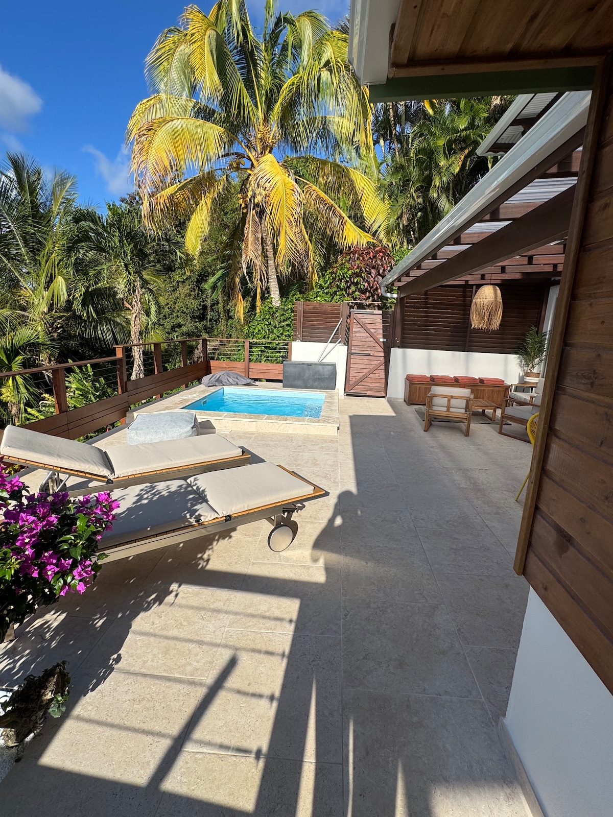 A la sombra del cerezo, protegido por el cocotero y el latanero el "kay a fwi" le dará la bienvenida en un jardín tropical. Situado en una zona tranquila y ventilada, se sentirá arrullado por el canto de los pájaros y la melodía de las hojas de lataneros. Desde los primeros rayos de sol, el agua de su piscina privada se calienta para bañarse tanto de día como de noche en total intimidad.