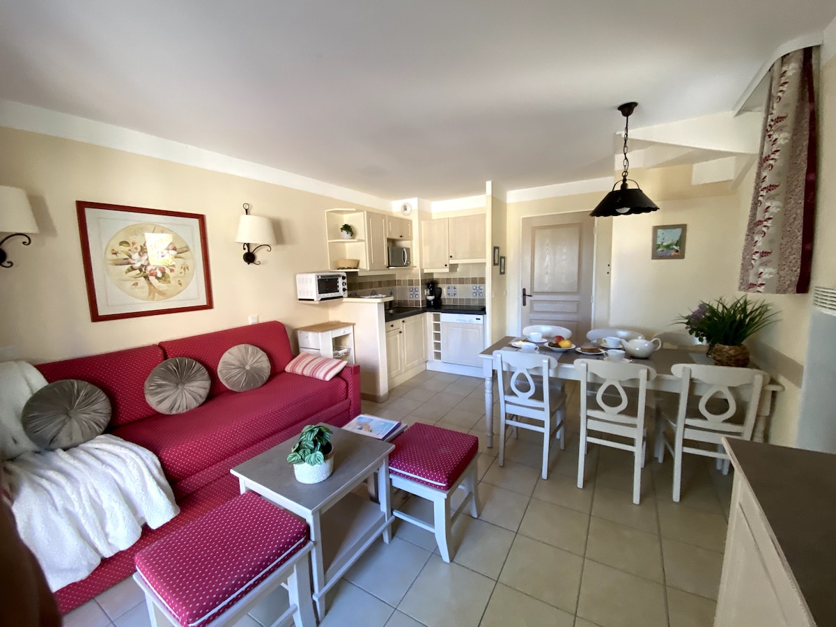 en una zona popular de la zona segura de Pont Royal, encantadora bastida con aire acondicionado con terraza, pérgola sombreada, bonito jardín acceso directo a la piscina privada de la residencia + acceso gratuito del 4 de abril al 30 de agosto a la piscina de olas y toboganes acuáticos de Pierre et Vacances exposición SO con vistas y puestas de sol a 3 minutos a pie, tienda de comestibles, bares, restaurantes, tenis, equitación, golf a 150 m fibra casa de campo agradable generosamente equipada, barbacoa Weber ideal vacaciones en familia