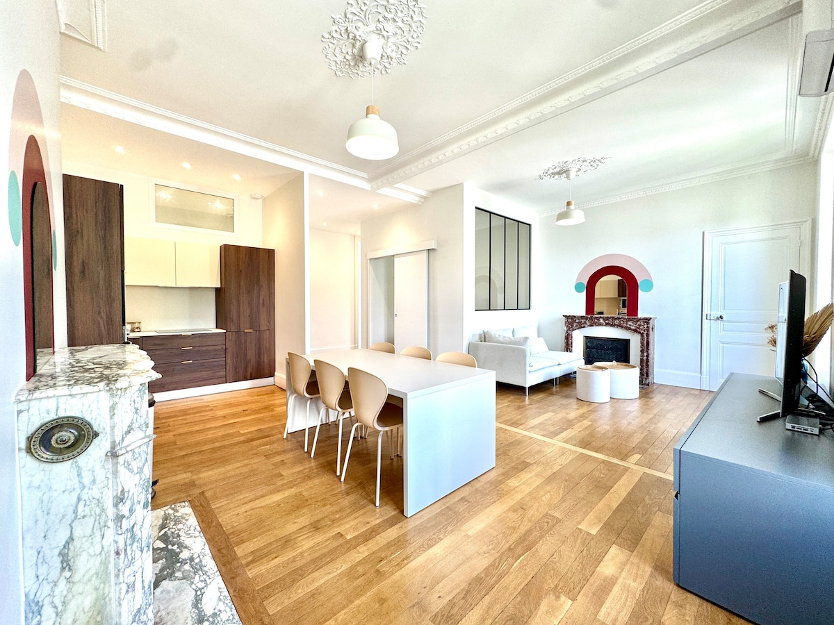 ¡Prueba la elegancia de este alojamiento excepcional! Completamente renovado por un arquitecto con materiales de alta calidad, este hermoso departamento de 90 m2 está compuesto por una sala de estar (sala de estar, cocina abierta), 2 dormitorios grandes, un vestidor, un baño de mármol con ducha a ras de suelo y 2 balcones amueblados. Beneficios: - aire acondicionado - Inalámbrico. - lavadora - lavavajillas - ropa de cama y toallas incluidas. ¡Ideal para disfrutar plenamente de Grenoble y sus alrededores!