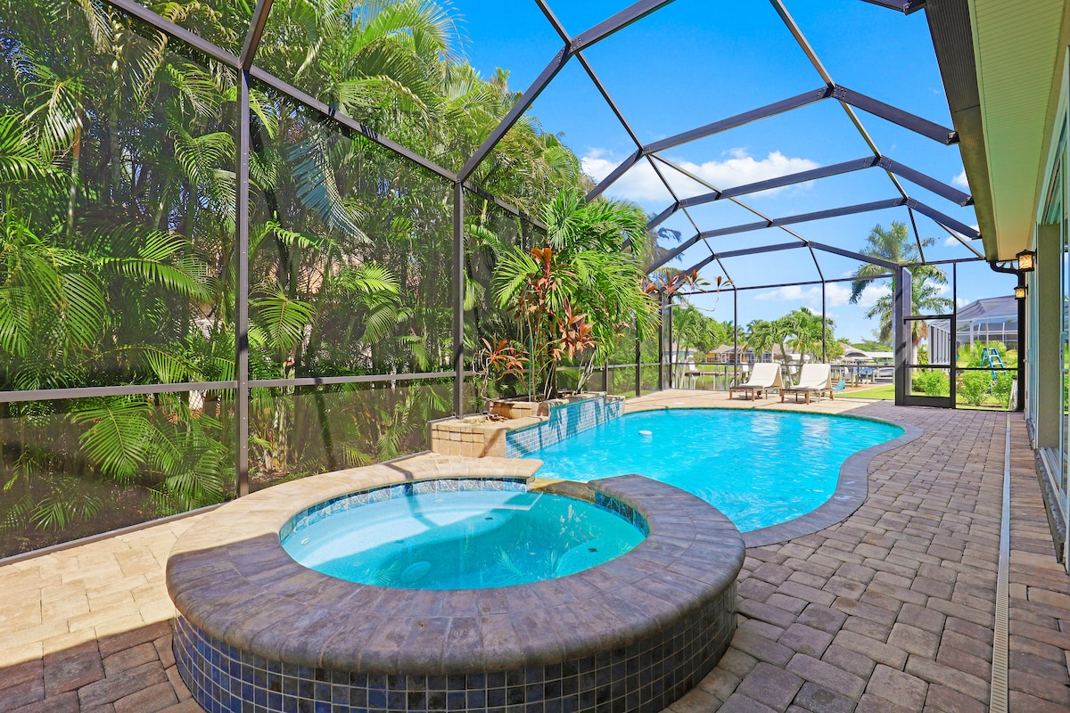 -All you need private retreat, 1 mile to downtown Cape Coral, 20 min to downtown Fort Myers & 25 min to Sanibel -Canalfront with heated pool & infinity-edge spa -Steam shower & spa-style toilets for a touch of pampering -Putting green & kayaks for outdoor family fun -Jet ski lift & 55’ boat dock—bring your water toys! -Two bikes for exploring the neighborhood -Tiki hut & comfy outdoor lounge for family hangouts -Game room with pool table, shuffleboard, piano & karaoke—endless entertainment