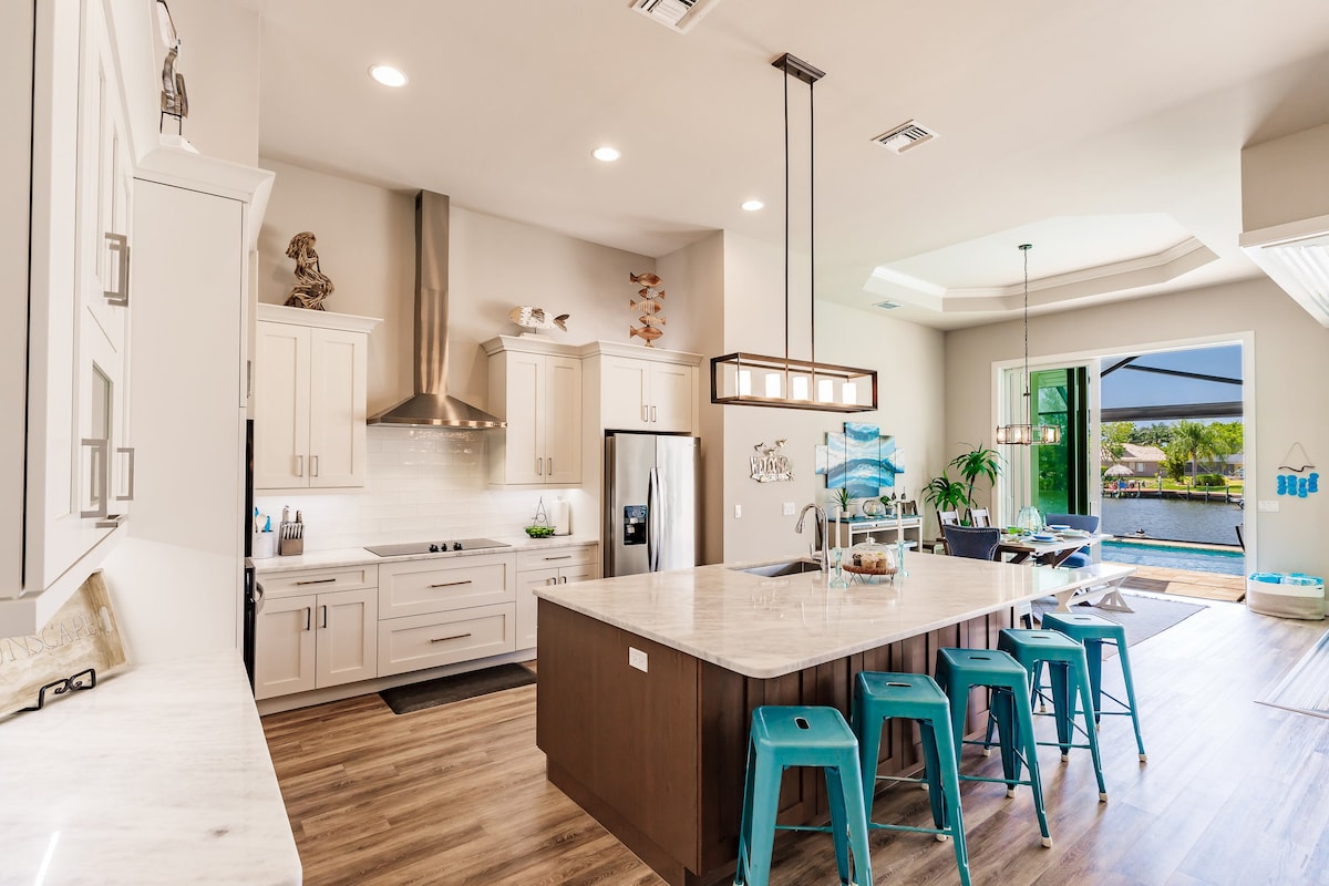 ¿Te gustaría nadar, relajarte al aire libre, pescar y disfrutar de hermosas puestas de sol en un amplio canal de acceso al golfo? Si es así, ¡te enamorarás de esta impresionante casa de nueva construcción hecha a medida! La casa de 2750 pies cuadrados es luminosa y espaciosa, con dos dormitorios principales en suites y un ala familiar separada. ¡La cocina gourmet, el comedor y la gran sala se abren a través de grandes ventanales al lanai y la piscina con vistas al canal en el muy deseado suroeste de Cape! ¡Villa inspirada en la playa! ¡Gran paseo de capitanes y Tiki! ¡Echa un vistazo a nuestras evaluaciones!