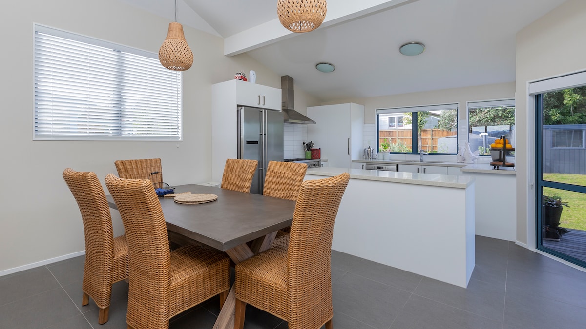 Enjoy a sunny and stylish experience at this centrally located townhouse in Matakana Village. Bright and sunsplashed with a spacious kitchen, indoor and outdoor living room, and a gorgeous bedroom upstairs with an AC / heat pump, the villa is across from 8 Wired Brewery and steps from the Farmer's Market, cinemas, and other Matakana shops and eateries.