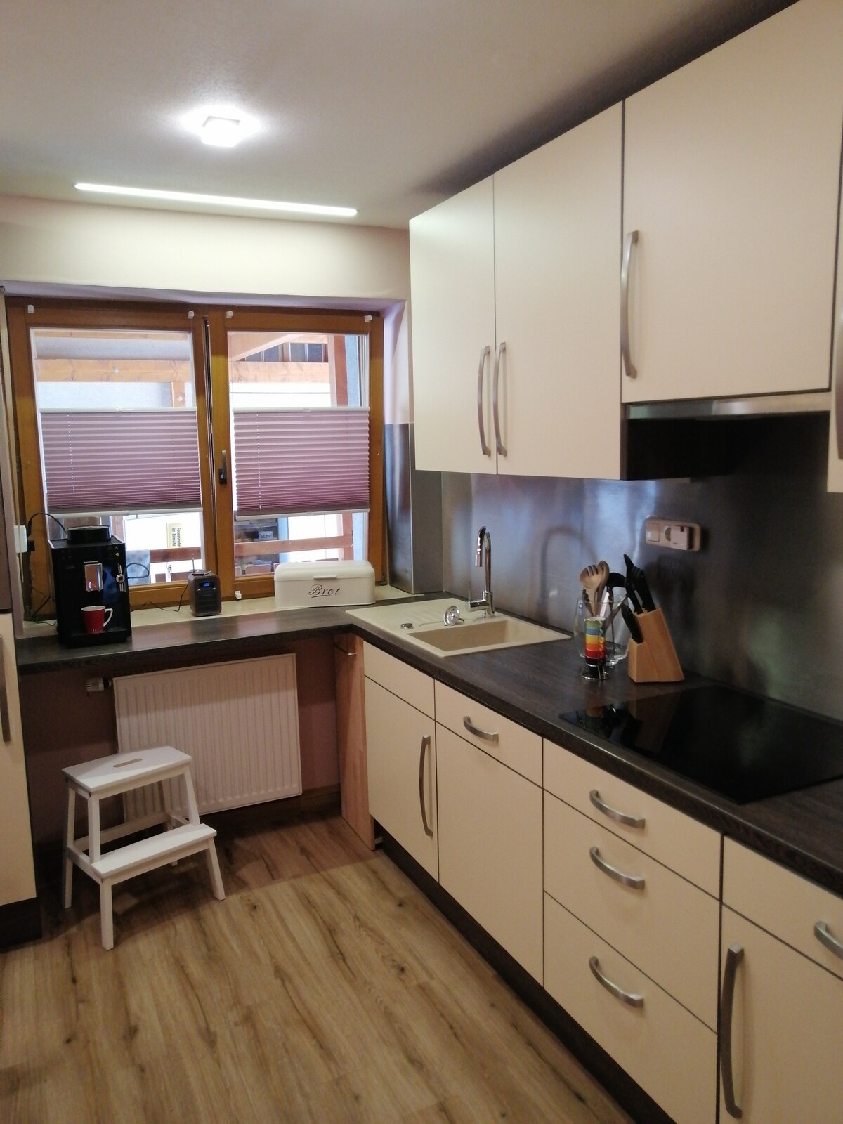 Disfruta de la vida sencilla en este alojamiento tranquilo y céntrico. Nuestro apartamento de vacaciones, que está muy bien cuidado y se encuentra en la calle principal, está a solo 250 m del carril bici principal. El apartamento está en la planta baja y cuenta con una nevera sin congelador, placa de cocina doble, cama doble (no separable), calefacción por suelo radiante, ducha, inodoro y lavabo, así como toallas, ropa de cama, cafetera de cápsulas y vajilla. Te alojas con una familia de viticultores con una taberna.
