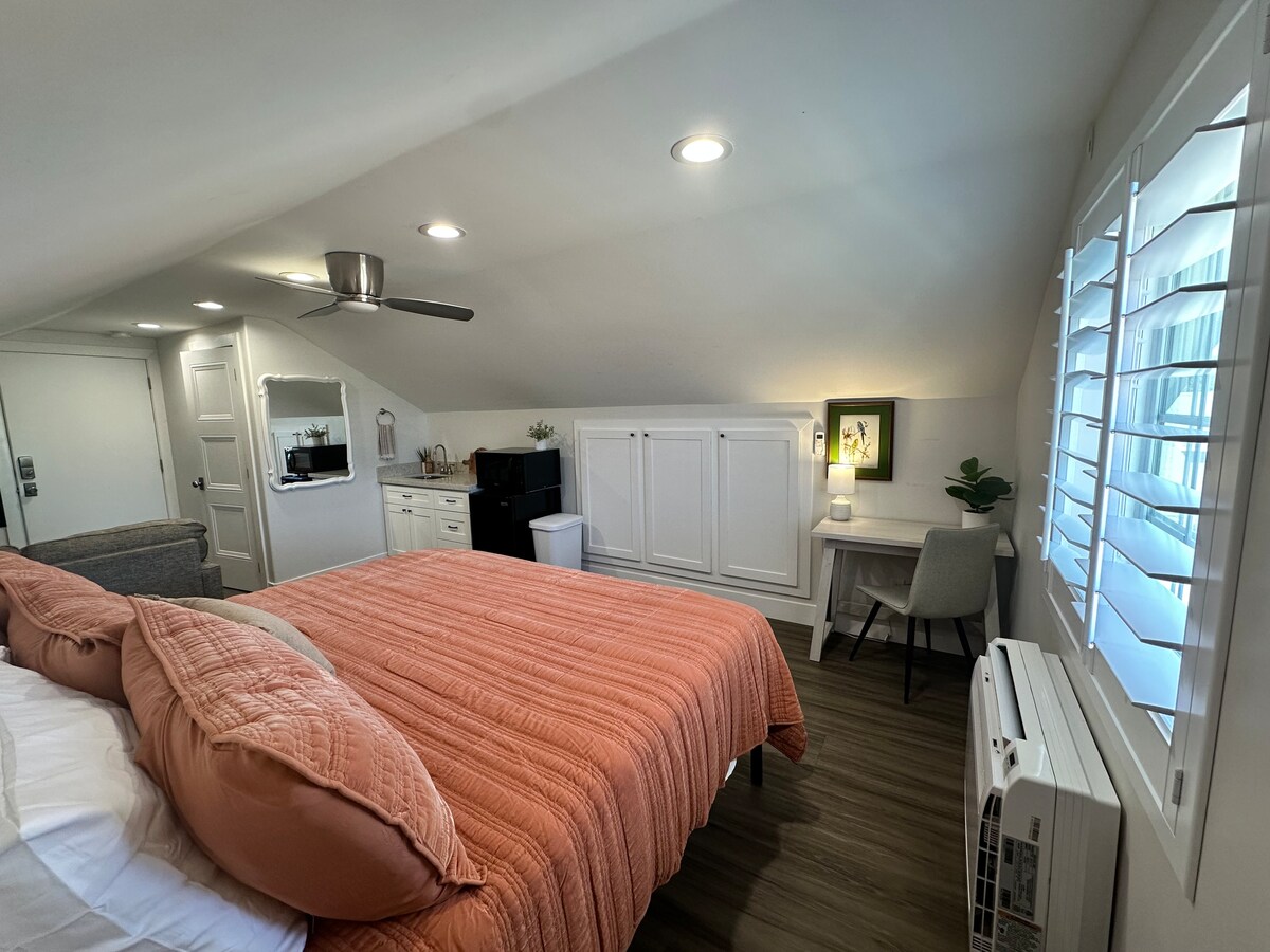 Acogedora casita en un barrio bonito y tranquilo. La cama tamaño California King tiene capacidad para dos personas cómodamente. La televisión de 50 pulgadas tiene cable, Netflix y un reproductor de DVD con una variedad de películas. Cafetera Keurig, nevera y microondas. Mesa de comedor en el interior. Los asientos al aire libre dan a un patio trasero tranquilo y pintoresco. Aparcamiento disponible en la entrada. Estaciona a la izquierda del garaje para 2 coches. Nuestra Casita es una habitación modesta en la que hemos hecho todo lo posible para que sea cómoda para los viajeros que buscan una alternativa a un hotel impersonal. No se admiten mascotas.
