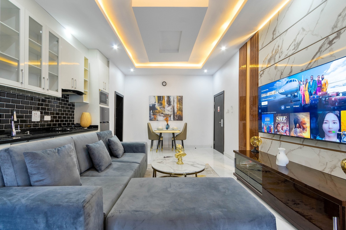 Un elegante apartamento de servicio de 1 dormitorio con mobiliario contemporáneo en una zona central segura situada junto a la calle más popular de Lekki, fase 1, junto al supermercado indígena más grande de Ebeano, un centro comercial de una parada: el centro comercial y los clubes, restaurantes, bares y salones. El apartamento es nuevo con ascensor, potencia las 24 horas, 2 plazas de estacionamiento, wifi gratuito, habitación con baño, aire acondicionado, cocina equipada, lavadora, Netflix en todas las habitaciones, TV y barra de sonido de 65 pulgadas y DSTV Premium.