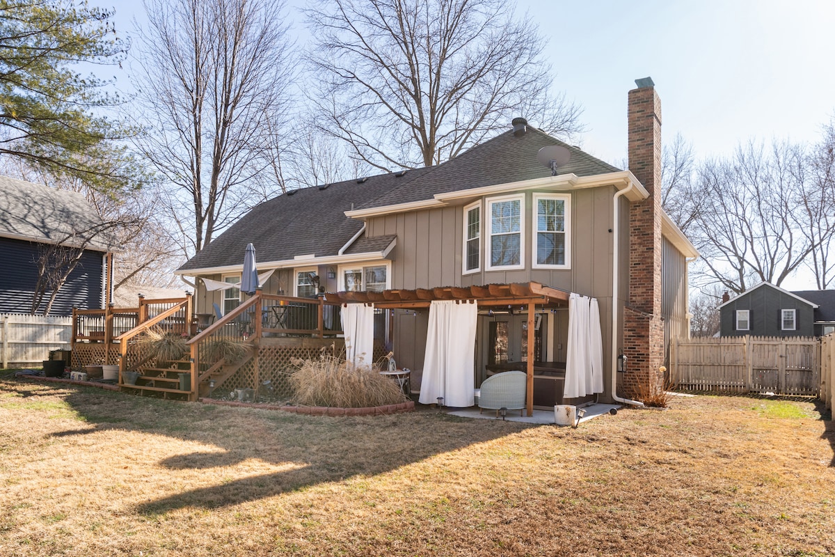 Welcome to our adorable, efficient 2 bedroom newly updated home with fenced yard for your fur baby. This is our home away from home. We hope you enjoy your stay with special features-like a great outdoor covered patio for playing oversized Jenga, cornhole or grilling up some KC BBQ! Centrally located off I-35 for easy dining, shopping & entertainment throughout Johnson County and Greater Kansas City. All new furnishings and fully stocked. King bed plus Daybed coverts to twins or another king!