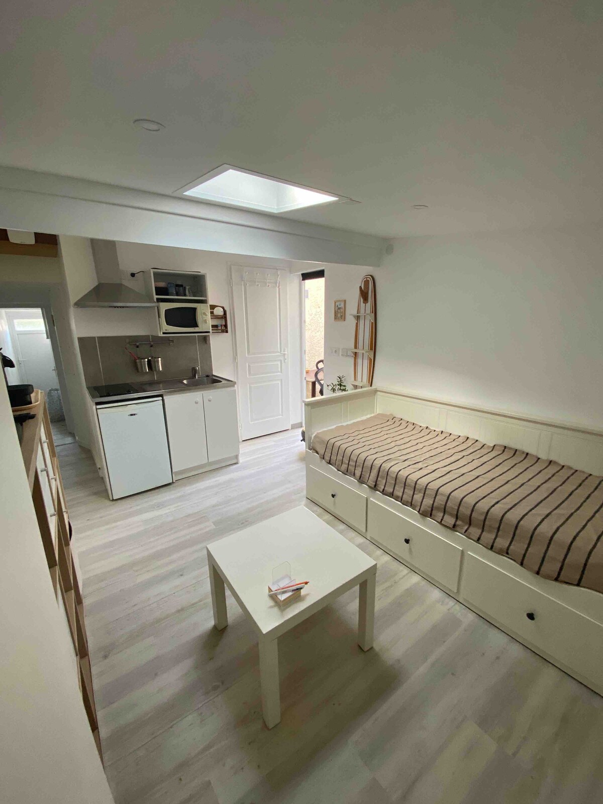 estudio casa con terrazas y jardín privado. dormirá en un cómodo sofá BZ. el estudio tiene un altillo que no se puede considerar como una habitación debido a la altura del techo, sin embargo, se puede dormir en una cama de 140 si la temperatura lo permite. 2 ventiladores proporcionados. Aunque hay 2 posibilidades de camas, el estudio está diseñado para 2 personas para preservar su seguridad se hace todo lo posible para desinfectar las superficies .