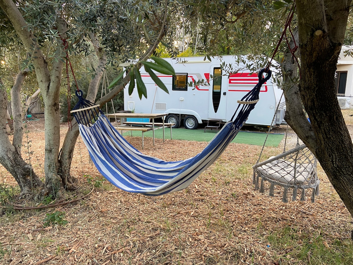 Nuestra acogedora caravana ubicada frente a un viñedo rural. A solo 25 minutos de tel aviv y a 30 minutos de Jerusalén . Esta caravana modelo de 2017 hecha por ADRIA (adora 613 UT) te ofrecerá una relajación completa y una sensación acogedora de acampar de la manera más moderna. ¡En la terraza de la caravana encontrarás muebles de jardín y horno de pizza de leña!