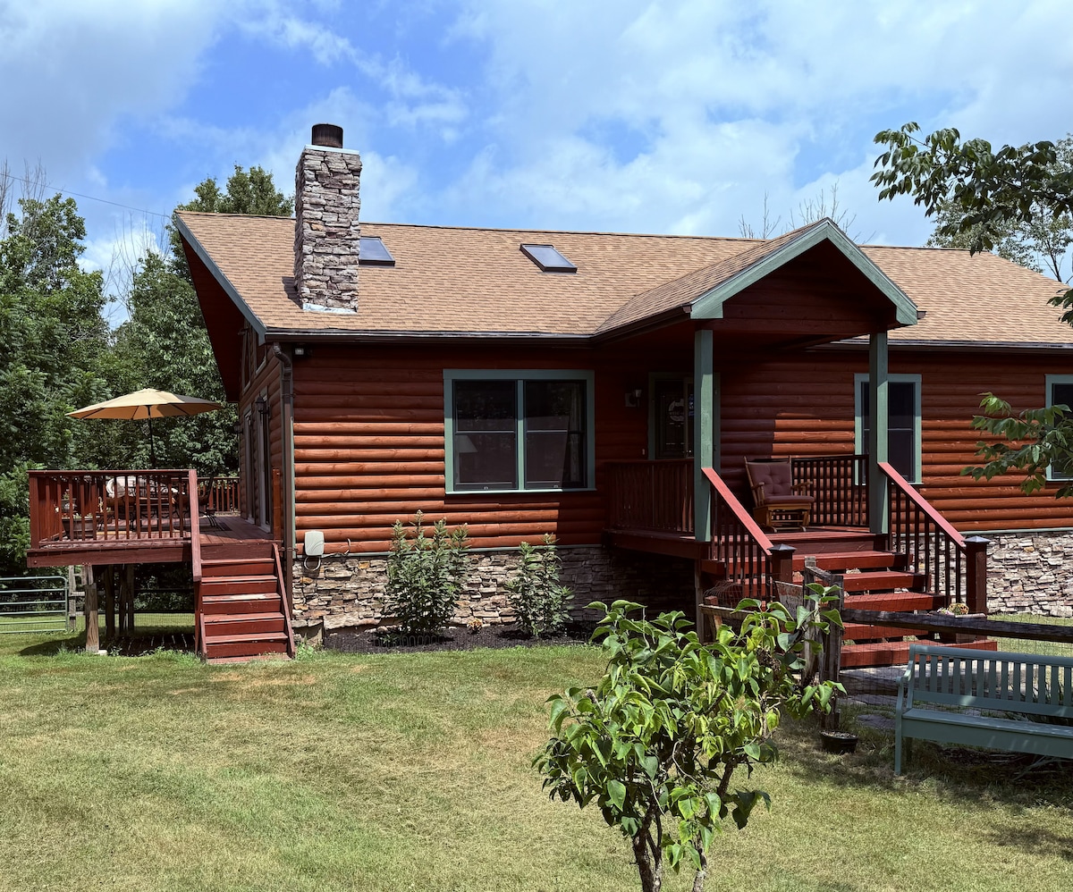 Amplia y tranquila cabaña de lujo en lo alto de las Catskills. Disfruta de las vistas a la montaña, haz smores y sumérgete en el jacuzzi. Ponte al día en la sala abovedada junto a la chimenea con nuestra amplia selección de juegos, mientras que otros ven películas en la planta baja. Organiza una cena con nuestra cocina totalmente equipada. Ubicación céntrica, a 20 minutos de 6 ciudades. Visita cervecerías, tiendas de antigüedades, cena, haz senderismo, pesca, golf o relájate. Internet rápido de 600 Mbps. Perfecto para grupos, familias, niños y mascotas. WFH, recién nacido, se admiten mascotas. Más de 3 noches tienen tarifa con descuento
