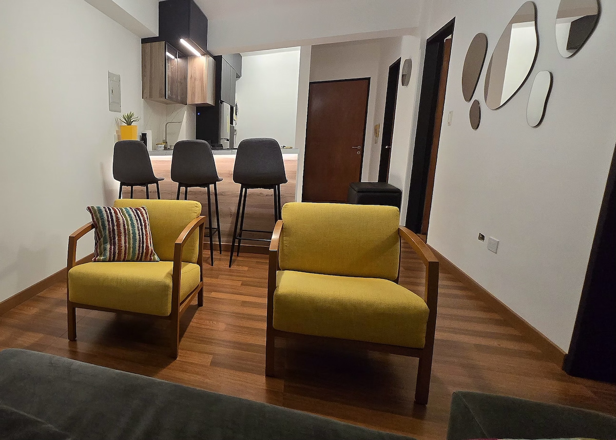 Disfruta de una estadía tranquila y acogedora junto a tu familia en este espacio diseñado para el descanso. Un lugar cómodo, funcional y con detalles pensados para que te sientas como en casa desde el primer momento. El alojamiento cuenta con una sala amplia y confortable, equipada con un sofá cama y un Smart TV de 50”, ideal para tardes de películas o series. A un costado encontrarás un comedor acogedor, con una hermosa vista a la ciudad, que se conecta perfectamente con la cocina.