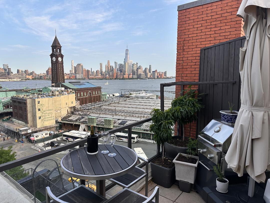 Apartamento ático en edificio histórico. Último piso, con terraza privada y vistas a Manhattan. Al otro lado de la calle de la estación PATH de Hoboken, ¡esta ubicación no se puede superar! A poca distancia de Manhattan en PATH o en ferry. Después de un día explorando Nueva York, ¡retírate a este lujoso ático y cena en la terraza privada con increíbles vistas de la ciudad! Tiene capacidad para 4 personas, 2 dormitorios y 2 baños (¡uno con bañera y vistas a la ciudad!).