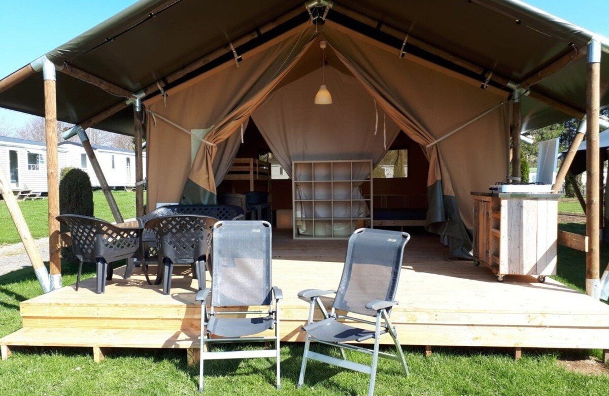 La tente est spacieuse, elle peut accueillir jusqu’à 4 personnes grâce à : 1 lit double et 1 lit superposé et dispose d'un coin cuisine équipé et de mobilier de jardin. Le camping dispose d'une pleine de jeux, d'un terrain de pétanque, d'un coin barbecue, de sanitaires communs avec douches et toilettes, d'une Piscine extérieure en été, de nombreux chemins de balade et d'un restaurant.