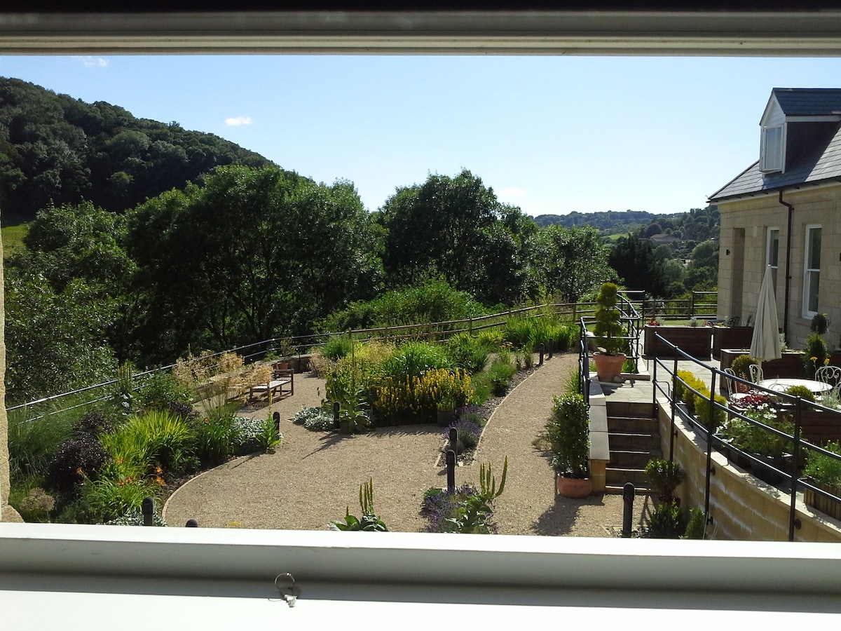 Stunning open plan contemporary 3 bedroom self-catering coach house on 3 floors set in beautiful grounds and views next to a lovely old victorian house also available for rental. 10 minutes drive into beautiful Bath with its lovely restaurants and bars. Lovely canal walks, cycling and narrow boating nearby. Enjoy a Country break with Fresh Air !! Where one couple stay we now offer a 10% discount . Please Look At our Reviews.