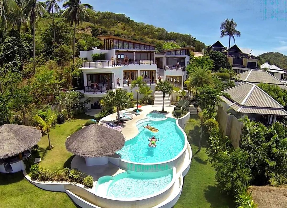 Ease into your dream Thai vacation with the seclusion, privacy, and fine facilities of this stylish villa. Friendly staff will welcome you at the grand wooden door, before leading you past the bright terrace, shining pool, laid-back long bar, and palapa-style relaxation spots. Pristine, organic style abounds inside, with picture-perfect beaches, buzzing markets, and tasty Thai restaurants nearby. Villa Palapa offers a pleasant combination of pure white and tropical teal with an integrated color scheme that runs both inside and out. Guests will wake to the beguiling, concentric wooden roof of the royal bedrooms, with ornate furniture and crafted statues infusing rich character into the rooms. Fine curtains, flashes of stained glass, and lively vegetation adds to the aura of well-thought out spaces, with blackstone surfaces distinguishing the comfortable bathrooms. A complimentary scrumptious breakfast awaits you daily in the finely-decorated, dynamic kitchen space, with the bright light of the sun terrace a constant temptation for guests. Located close to the one of the most happening districts of Koh Samui, guests are spoilt for choice regarding day activities. Kilometres of golden sand and blue water await at local Bophut Beach, with close by restaurants and welcoming bars offering a new chill-out spot every day. Fascinating boat rides out to the rocky spires and grand isolation of the Angthong National Marine Park are a popular option, as is exploring the trails and lanes of the island’s interior, hiding impressive viewpoints and cascading waterfalls. After a busy day, a delicious cocktail awaits at the garden bar. Copyright © Luxury Retreats. All rights reserved. BEDROOM & BATHROOM • Bedroom 1 - Primary: Super king size bed, Twin size bed, Ensuite bathroom with stand-alone rain shower, Dual vanity, Walk-in closet, Television, Sonos sound system, Safe, Balcony, Mountain view • Bedroom 2: King size bed, Twin size bed, Ensuite bathroom with stand-alone rain shower, Television, Safe, Desk, Direct access to pool • Bedroom 3: King size bed, Twin size bed, Ensuite bathroom with stand-alone rain shower, Television, Safe, Desk, Direct access to pool • Bedroom 4: King size bed, Twin size bed, Ensuite bathroom with stand-alone rain shower, Television, Safe, Desk, Direct access to pool • Bedroom 5: King size bed, Twin size bed, Ensuite bathroom with stand-alone rain shower, Television, Safe, Desk, Direct access to pool • Bedroom 6: 2 Twin over double size bunk beds, Ensuite bathroom with stand-alone rain shower, Television, Desk, Safe, Direct access to pool • Bedroom 7: King size bed, 2 Twin size beds, Ensuite bathroom with stand-alone rain shower, Television, Pool table, Balcony, Outdoor furniture, Mountain view FEATURES & AMENITIES • More under “What this place offers” below OUTDOOR FEATURES • Day bed Included: • More under “What this place offers” below Extra cost (advance notice may be required): • Activities and excursions • Babysitters • More under “Add-on services” below