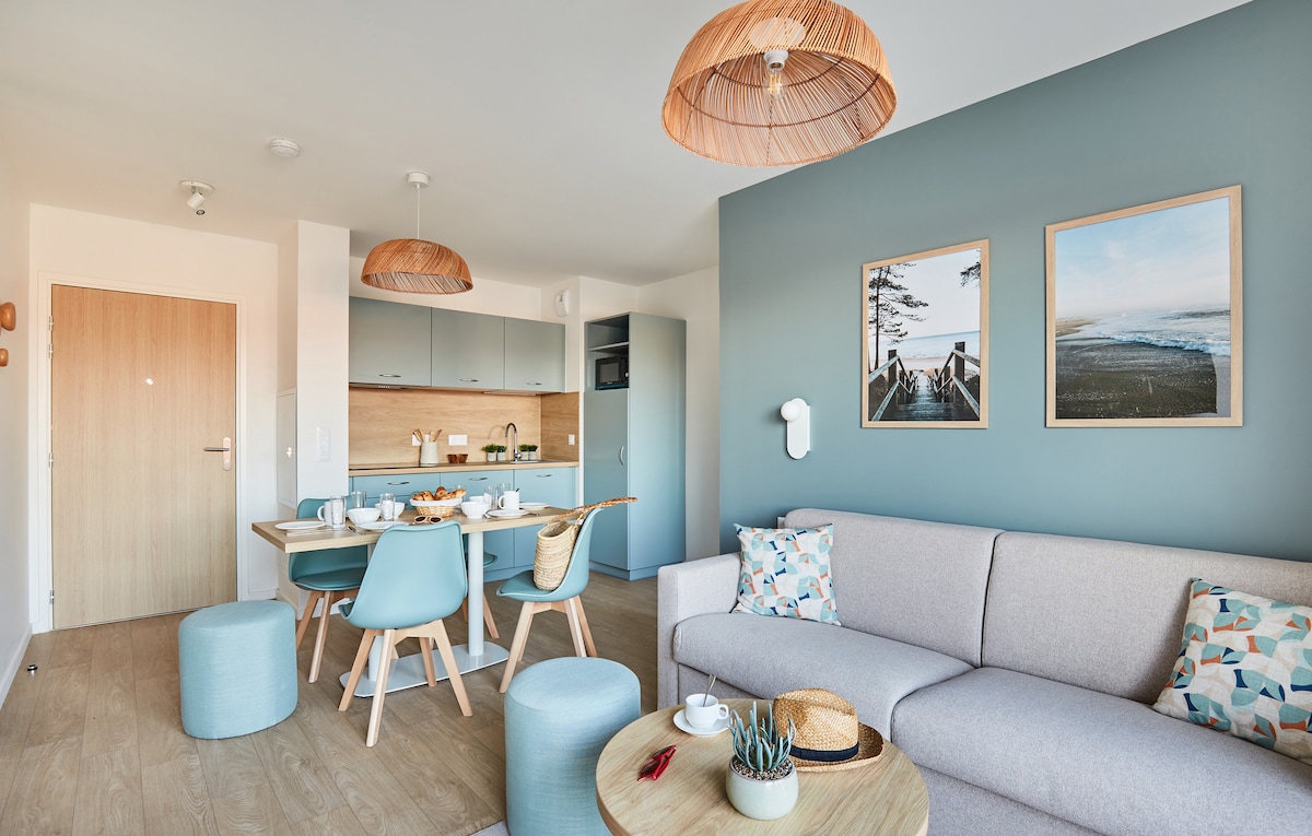 Douceur Océane: Apartamento para 4 personas de 45 m2, 2 dormitorios, gran terraza orientada al sureste. No se preocupe por nada. Las camas estarán hechas a su llegada y la ropa de cama se le proporcionará de forma gratuita. Relájese, así que ahora al lado de la piscina al aire libre o interior, relájese en la sauna o en el gimnasio. La playa está a 3 minutos a pie, el golf está muy cerca, al igual que las tiendas y restaurantes. Mercado de verano los martes y jueves.
