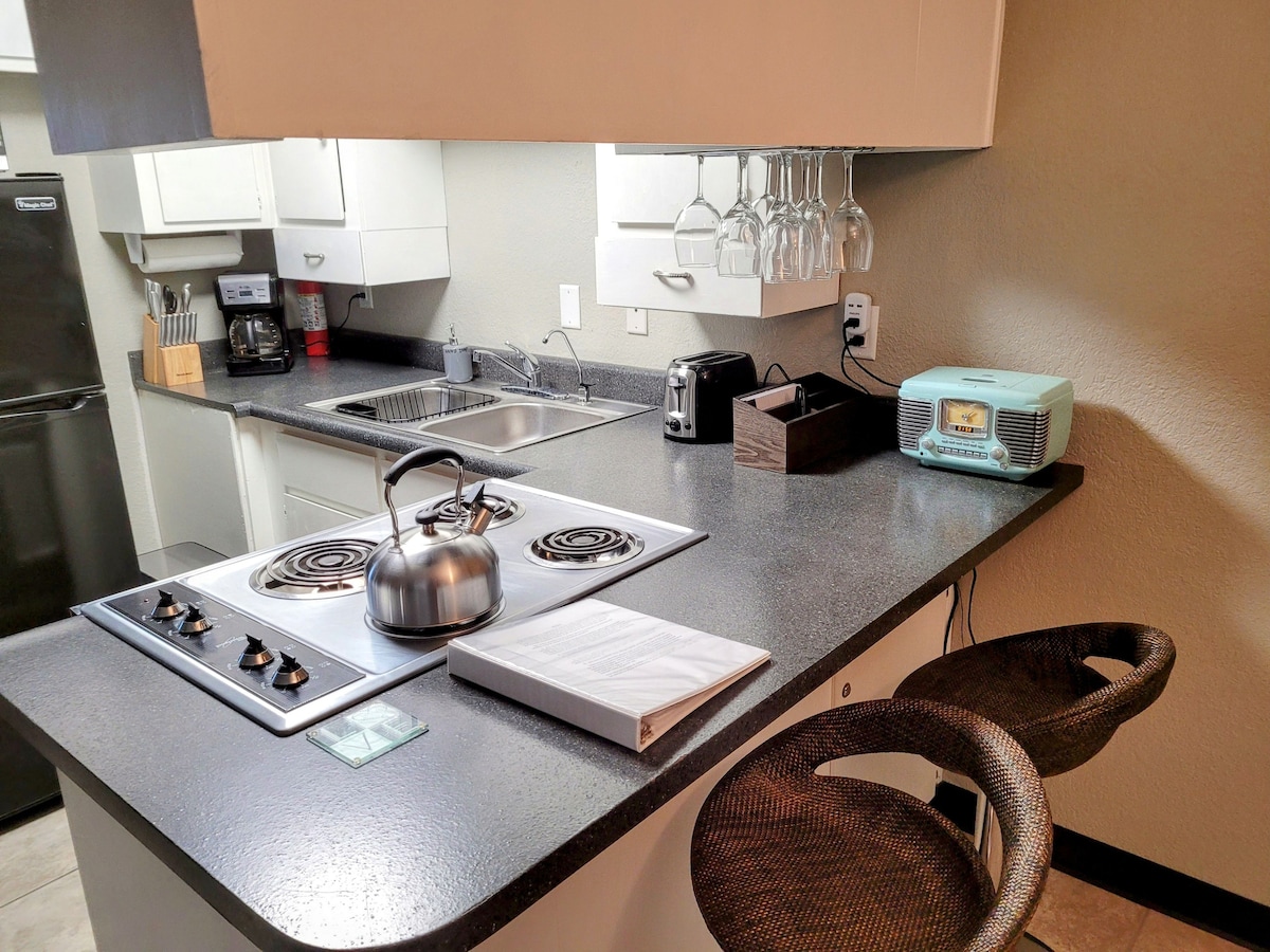 Este apartamento de 672 pies cuadrados en la planta superior, con un dormitorio y un baño, bellamente renovado, cuenta con encimeras de cocina de granito y está a poca distancia a pie de Rotary Park, el lago, el puente de Londres, el campo de golf y restaurantes divertidos. Nuestro apartamento tiene capacidad para cuatro personas y ofrece un dormitorio con cama tamaño king y TV. La sala de estar principal ofrece una cama queen plegable. Las características adicionales incluyen wifi gratuito, una lavadora/secadora de pila de pequeña capacidad y un vestidor. Nuestra intención es que crees recuerdos maravillosos de Lake Havasu.