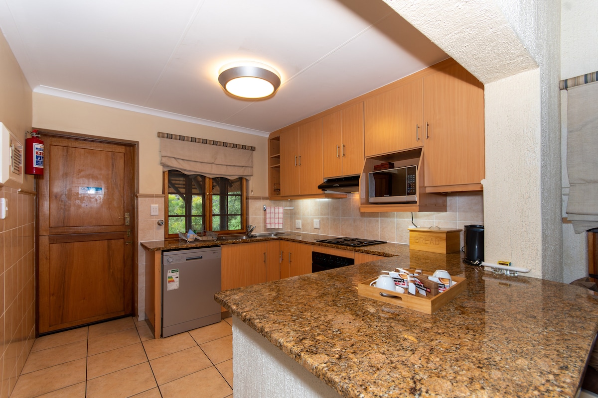 Ubicado a 10 minutos de la zona sur de Kruger, nuestro moderno, espacioso, cómodo y independiente chalet de 3 dormitorios/3 baños es su ubicación ideal para su safari Kruger. Escucha a los hipopótamos mientras contemplas la puesta de sol desde nuestra gran terraza, usa la parrilla al aire libre y disfruta de las numerosas instalaciones del centro vacacional después de un día de increíbles avistamientos en Kruger Park. Para superar la reducción de carga, tenemos una estufa de gas junto con batería de respaldo para luces, ventiladores, refrigerador, TV/decodificador, router y enchufes.
