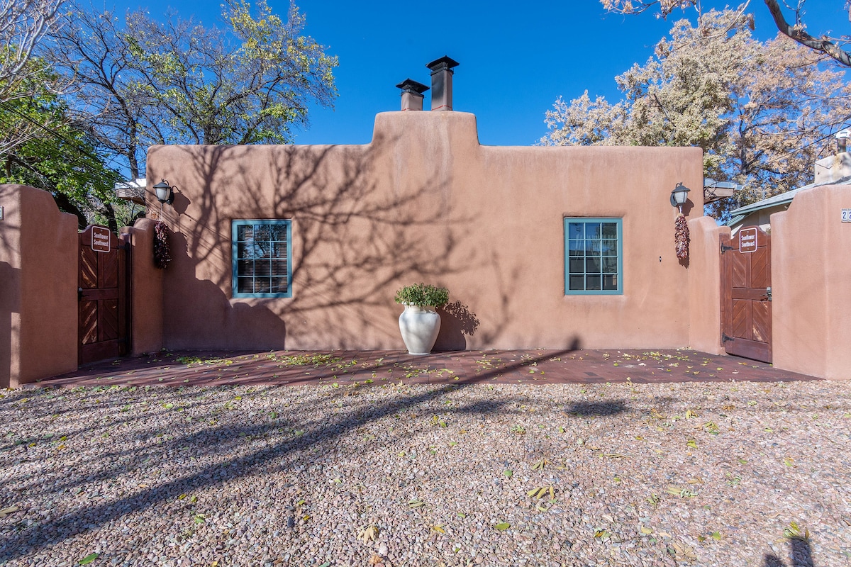 Alójate en esta romántica y acogedora casa de campo de 405 pies cuadrados en un complejo privado con estacionamiento fuera de la calle. Cómoda, con todas las comodidades de un hogar. Calle histórica tranquila y segura del lado este; cama tamaño queen, cocina, lavadora/secadora, a poca distancia a pie de Santa Fe Plaza, Canyon Rd.La Posada Resort, el Drury, el Inn on the Alameda, el río Santa Fe, la catedral, el centro de convenciones, Railyard, museos, restaurantes y bares. Alójate aquí y disfruta de todo el centro de la ciudad. No es necesario conducir ni encontrar aparcamiento.