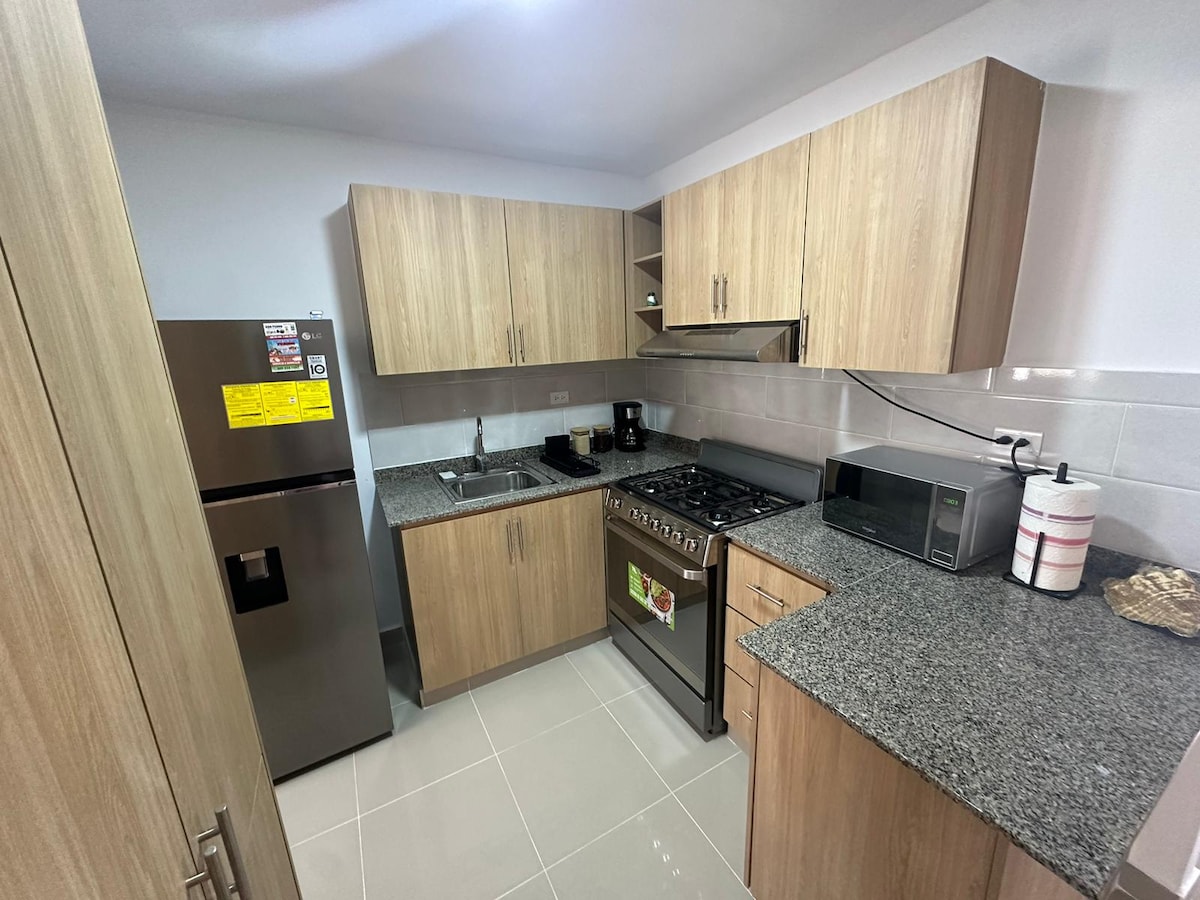 Apartamento acogedor, en un 3er piso, dentro encontrarás todo lo necesario para una estadía agradable, cocina equipada, área de lavado, 2 habitaciones con cama doble, habitación principal con aire acondicionado, segunda habitación con abanico, un baño. En zonas aledañas encontrarás supermercados, centros comerciales y a unos minutos la Embajada Americana y el Aeropuerto la Isabela. El agua tiene y contamos con tinaco interno que abastece