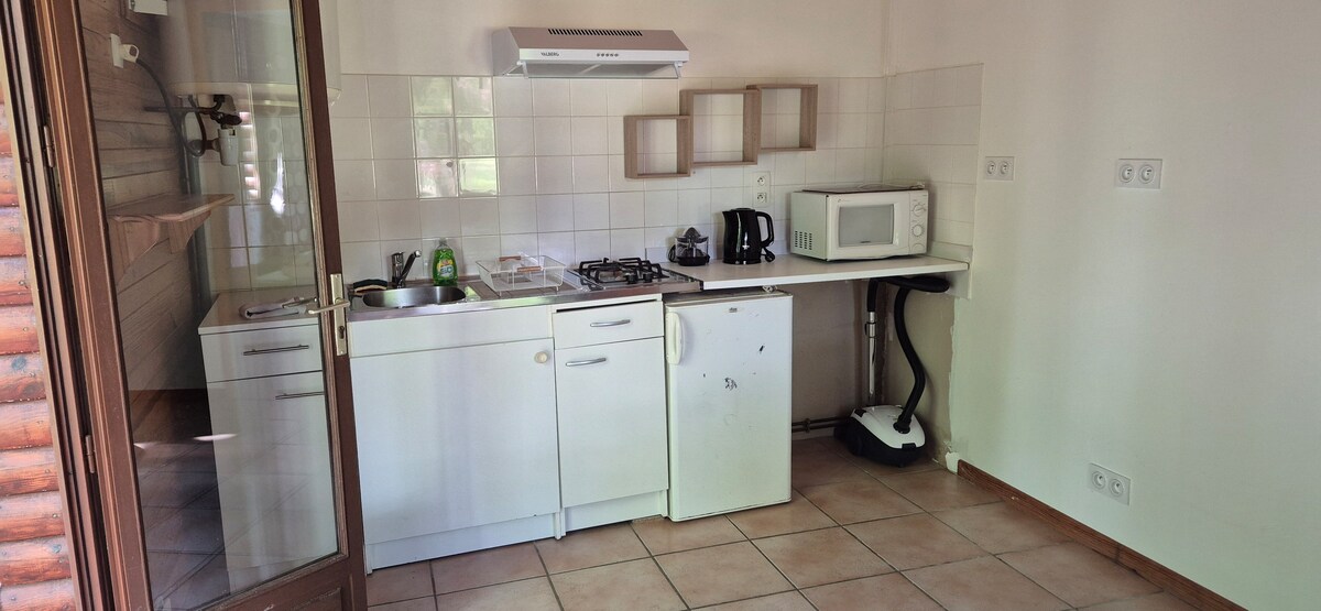 Agréable petit chalet de 38m², idéalement situé: à 13 minutes à pied du Parc Walibi/Aqualand, à 15min à pied de l'aéroport, à 10 minutes des transport en communs et à 5 min en voiture du centre ville d'Agen.