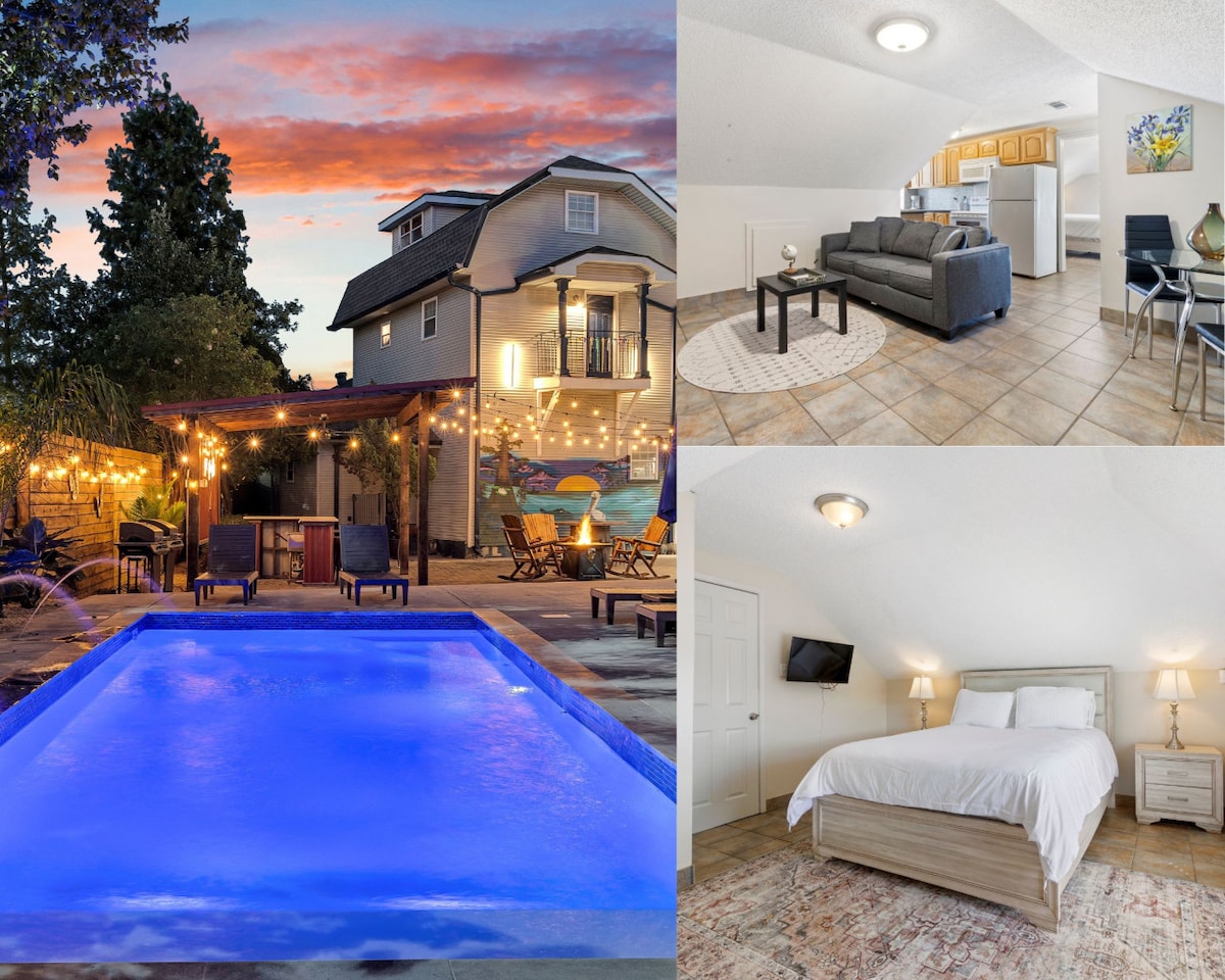 Suites de hotel 4BR/4BA para grupos con piscina, aparcamiento y 7 televisores