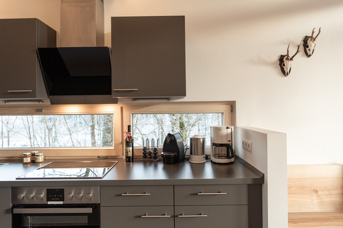 Les ofrecemos una casa doble con dos apartamentos igualmente equipados y acogedores en una casa de campo nueva con un ambiente muy especial. Ambos apartamentos tienen capacidad para hasta 6 personas. Disponen de una sala de estar con cocina totalmente equipada, un amplio sofá y una estufa de leña para una calidez agradable. A partir de ahora también podrás disfrutar de la magia de la montaña en la sala de bienestar de nuestra casa. Esta zona es accesible desde ambos apartamentos y se encuentra en el sótano.