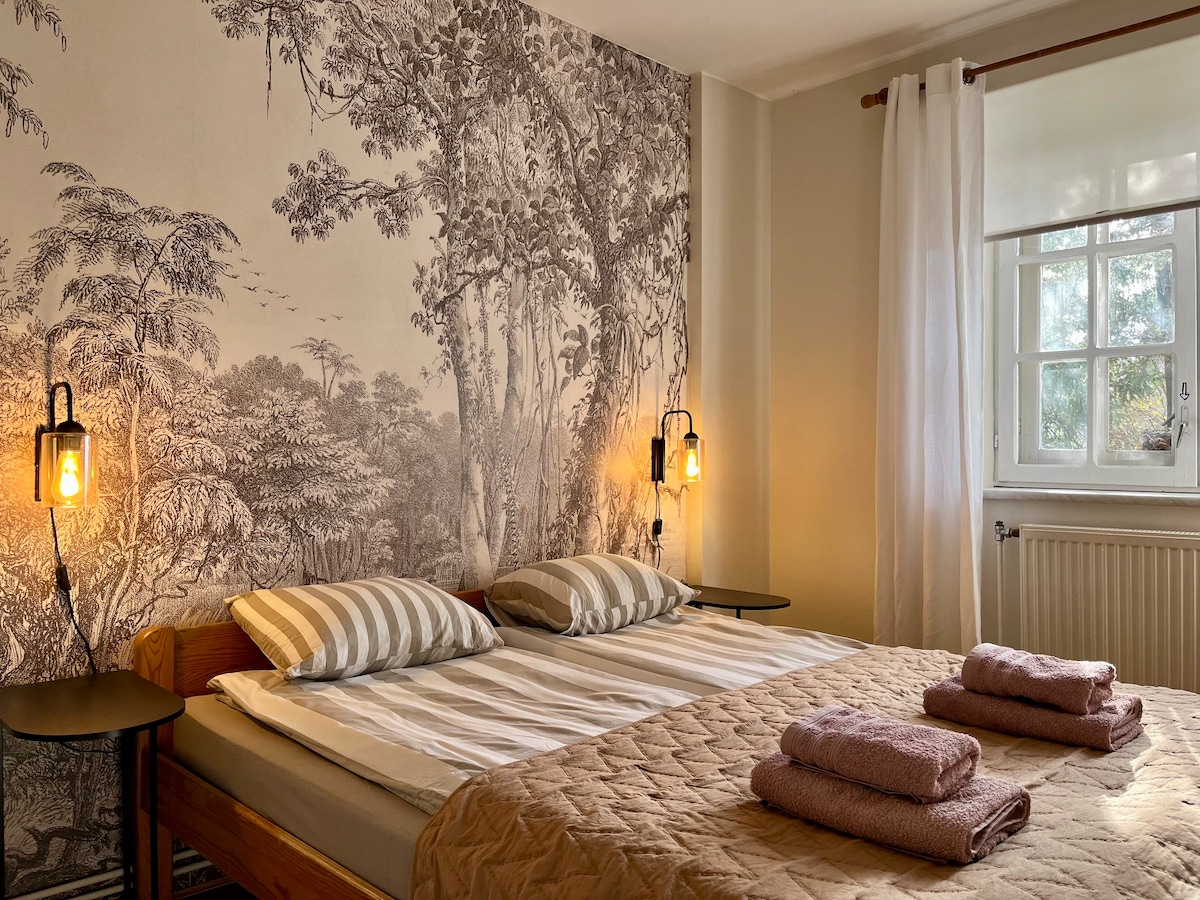 Amplio departamento en el piso superior de la casa, con dos dormitorios, comedor, sala de estar, cocina y un baño, en una casa unifamiliar junto al bosque, en las afueras de un pequeño asentamiento, ofrece reservaciones cortas o largas. Puedes relajarte aquí solo, con tu familia o amigos. En la propiedad hay un aviario con una pequeña bandada de pavos reales. El vecino inmediato del jardín es un bosque de pinos con su encanto climático único. Cerca también hay un río de montaña Kwisa.