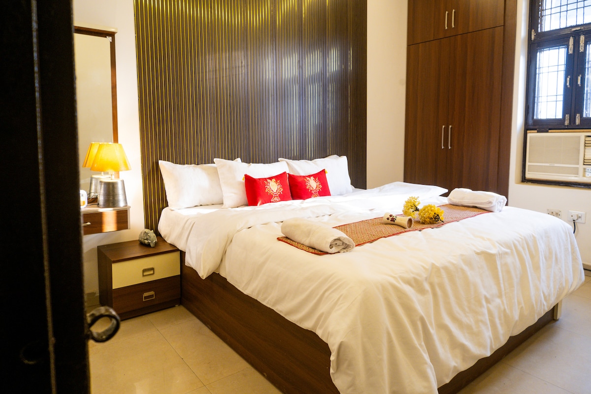 Escápate a nuestro cálido y acogedor departamento de 1BHK, ideal para familias, parejas o personas que viajan solas. Ubicada en una zona privilegiada, nuestra acogedora morada ofrece la mezcla perfecta de comodidad y conveniencia. Servicios: - 1 dormitorio espacioso con aire acondicionado y una cama tamaño king. - 2 sofás cama en la sala de estar - Cocina totalmente funcional con servicios básicos, perfecta para preparar comidas. - Baño adjunto para mayor comodidad. - Mesa de comedor para las comidas.