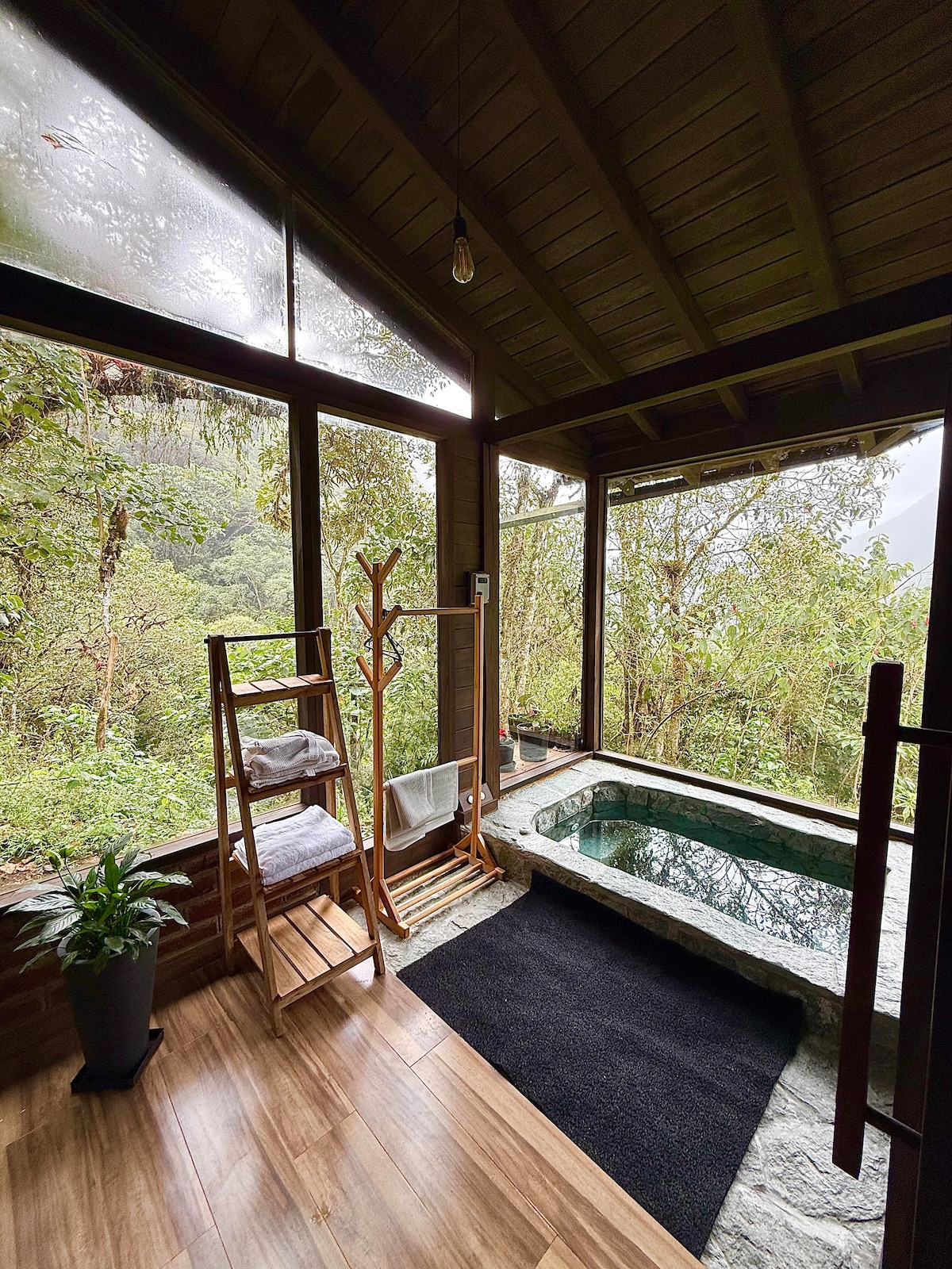Bienvenido a este refugio moderno en el corazón de los Andes! Si vienes con amigos o con tu adorada familia; sumérgete en nuestro jacuzzi al aire libre rodeado de un tranquilo jardín. Las 3 habitaciones ofrecen vistas únicas: la principal con cama king y vistas a los Andes, la twin con decoración de cascadas de Baños de Agua Santa, y la matrimonial con vista hacia los bosques de Illuchi. ¡Te invitamos a crear recuerdos inolvidables en nuestra villa en Baños de Agua Santa!