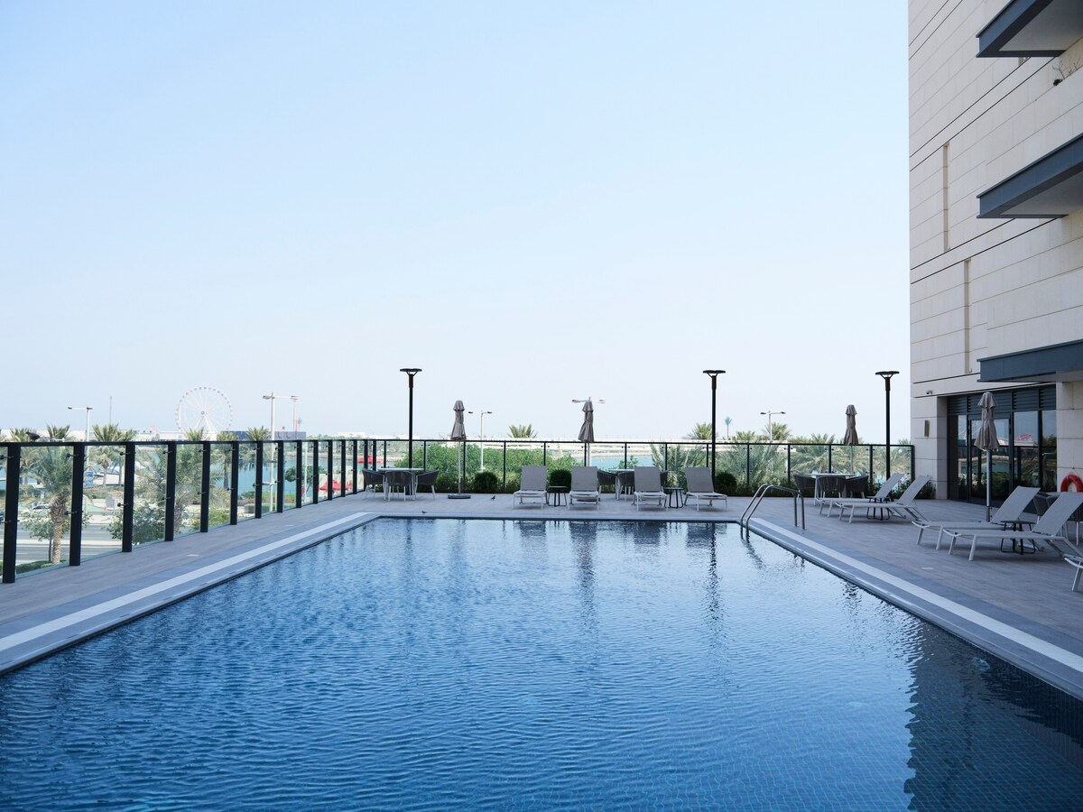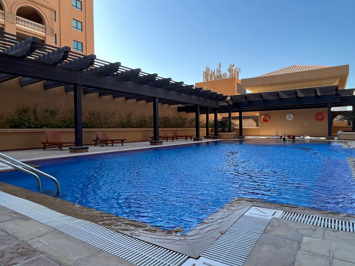 Despierta con brillantes vistas al puerto deportivo en este espacioso apartamento 1BR en Porto Arabia, The Pearl-Qatar. Disfruta de un balcón privado, cama tamaño king, 1,5 baños, cocina completa, armarios empotrados y una amplia sala de estar con un televisor inteligente de 65 pulgadas. Ideal para parejas, huéspedes solitarios o viajeros de negocios. Supermercado SPAR en la planta baja, además de cafeterías y tiendas cercanas. Incluye wifi rápido, estacionamiento, lavadora, sábanas limpias y seguridad las 24 horas. Tranquila, elegante y a unos pasos del agua, ¡tu escapada perfecta a Qatar!