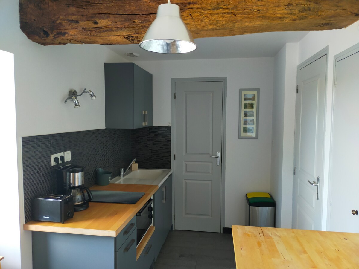 El estudio, que consta de dormitorio (camas hechas), cuarto de baño (ducha y lavabo, toallas incluidas), cocina americana (placas eléctricas y horno microondas) y WC, se encuentra en el primer piso de un castillo (siglos XV y XVIII) en un entorno florido y arbolado, tranquilo, a 1 km del pueblo por un camino forestal privado. Puede, a través del anuncio «estancia en el castillo», beneficiarse de 2 habitaciones. (ver el anuncio en Airbnb)