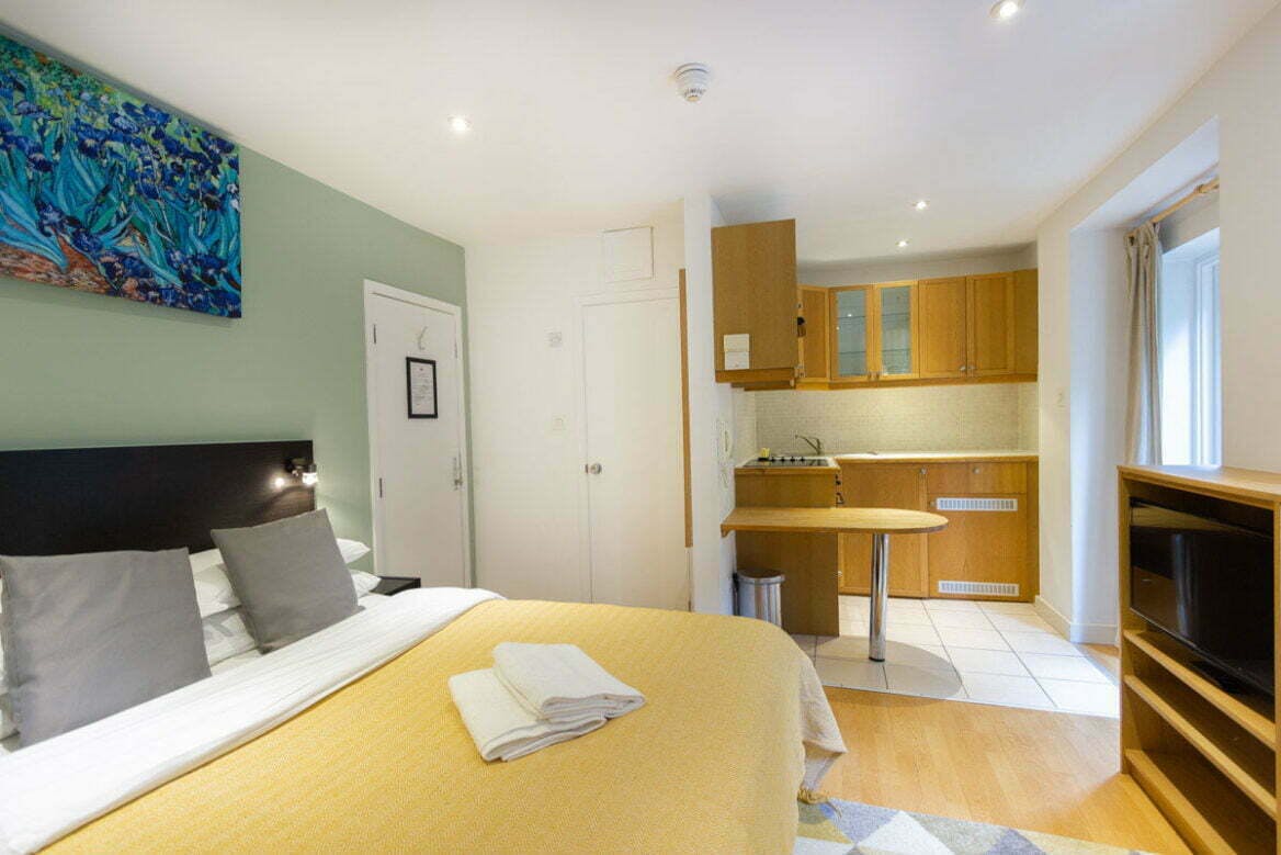 Tratar de encontrar un alojamiento para 5 personas en Londres siempre es difícil. Ahora en The Suites St Pancras Hotel Group puedes disfrutar de los 30 metros cuadrados que tenemos mientras tienes la privacidad de dos habitaciones, cama tamaño Super King, aire acondicionado en todas partes, cocina americana con minibar, TV inteligente de pantalla ancha, wifi, cortinas opacas, enfrente de Kings Cross St Pancras, la puerta de entrada a Europa, acceso por ascensor a tu suite, ¿qué más se puede pedir?