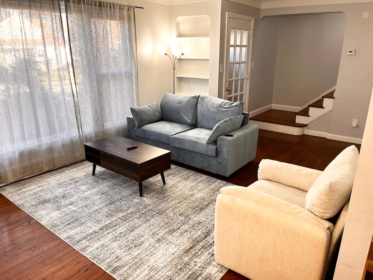A large, comfortable space perfect for longer-term stays. It features a private, full bathroom with tub, kitchen with sink, fridge, convection oven, hot plate, dishes, and more. Walk-in closet, cozy futon bed with memory foam pad, living room area with smart TV, and dining room/study table. Access to washer and dryer, and free parking spot in our driveway. Very cozy, quiet space great for people in transition, interns, students or residents. FYI: cats live onsite (but are kept out of the suite)