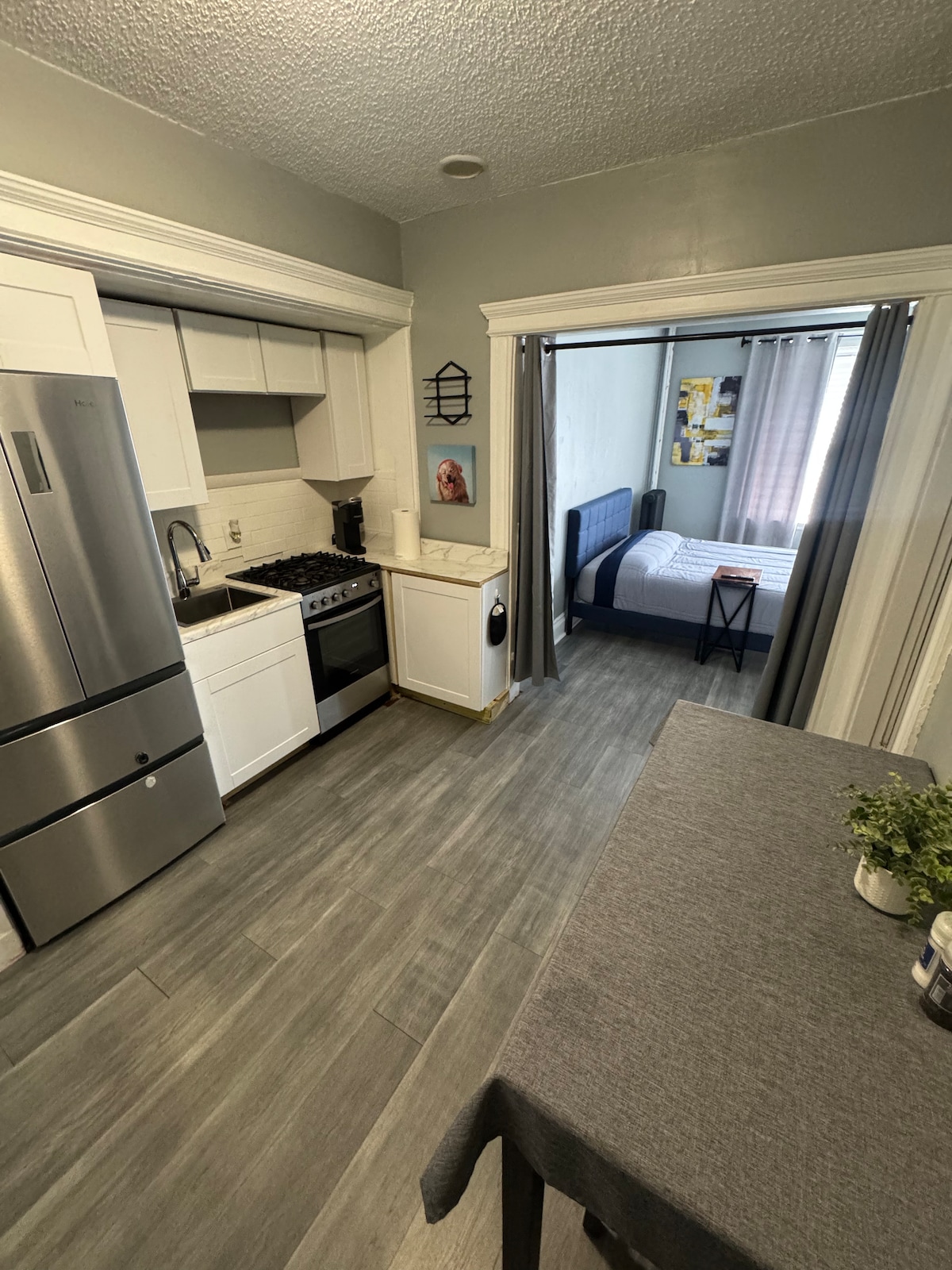 Planta baja. Amplia habitación con una cama tamaño king y una habitación extra con un sofá (cama individual extraíble) y escritorio/tocador. El amplio baño está recién remodelado. La cocina pequeña tiene un fregadero pequeño, nevera y microondas. Se encuentra en un barrio tranquilo a pocos minutos de una vía férrea, la ruta 62, la interestatal 95, la ruta 1 y la ruta 128. Aparcamiento en la calle. Estamos a 5 millas de Salem Mass, a 44 millas de New Hampshire, a 77 millas del canal de Cabo Cod y a 19 millas de Boston. Estamos a 4 millas de la estación de tren de Beverly.