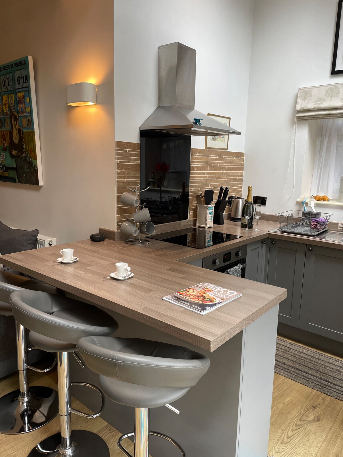 This is the original Barbrook schoolroom built by the Methodists in 1870 - a large airy groundfloor space with tall windows looking out across the valley. It is now a romantic hideaway for two - an elegant but comfortable open-plan apartment featuring log stove, large bed, and window seats, plus underfloor heating, modern well-equipped kitchen and bathroom, and smart TV. It's an ideal base from which to explore all the pleasures of Exmoor by the sea, and your hosts are just next door if needed.
