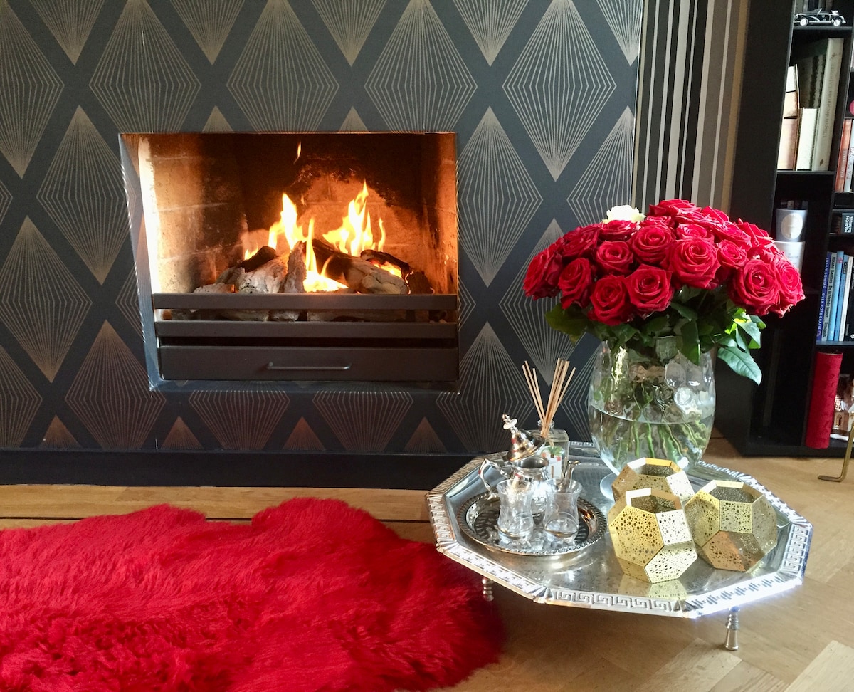 En el ático está tu habitación de lujo, con todas las comodidades. Te espera un lujoso baño, equipado con calefacción para toallas y ducha de efecto lluvia, y tu cocina totalmente equipada tiene una placa de inducción, nevera y lavavajillas.