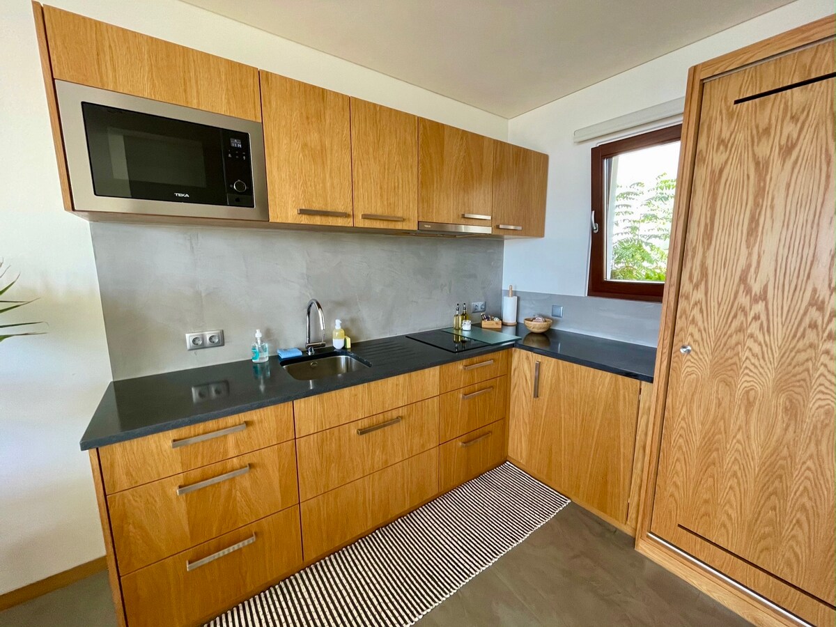 Meu Pé de Cacau is a tropical fruit garden surrounded by dramatic cliffs to the north-east and the vast Atlantic Ocean to the south-west. Four beautifully designed and sustainably built studios share the property with an infinity pool, social areas, and luxurious plantations hosting hundreds of different tropical fruits, planted on traditional agricultural terraces handcrafted in basalt stone.