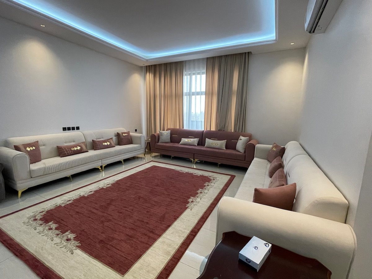 Disfruta con toda la familia en este elegante alojamiento. Apartamento moderno de lujo * Diseñado y equipado para su comodidad * Consta de dos habitaciones (master y habitación con 3 camas) Amplio salón abierto a la cocina moderna Diseño elegante (pantalla Samsung Smart WiFi) Cocina totalmente equipada - Frigorífico - Horno + microondas + lavadora - Todos los utensilios de cocina completos- - Fogones (gas/eléctricos) Además de la ubicación privilegiada A 8 minutos en coche de la estación de tren A 10 minutos en coche del aeropuerto A 5 minutos en coche de la mezquita de Quba A 15 minutos en coche de la Mezquita del Profeta