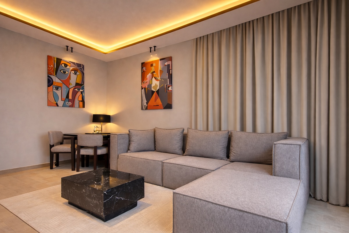 Experience modern comfort in this elegant 1-bedroom apartment at Silverpalm Compound, New Cairo. Designed with premium finishes and stylish furniture, it features a spacious living area with a sofa bed, a fully equipped kitchen, and two contemporary bathrooms. Perfectly located steps from O1 Mall, offering top restaurants, cafés, gyms, and leisure facilities.. ideal for business or leisure stays.