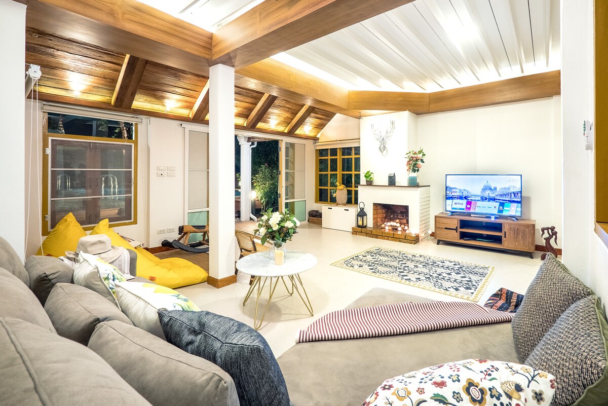 Nuestra encantadora casa es semi-de madera con 3 dormitorios con aire acondicionado y 3 baños. Está equipada con cocina, bar, wifi de fibra óptica y un gran espacio abierto en la planta superior. Es perfecta para una familia con niños o un grupo de amigos. Estamos a 10 minutos a pie de la Puerta de Chiang Mai y de la calle peatonal del sábado. Ofrecemos desayuno casero gratuito todas las mañanas y servicio de recogida gratuito desde el aeropuerto.