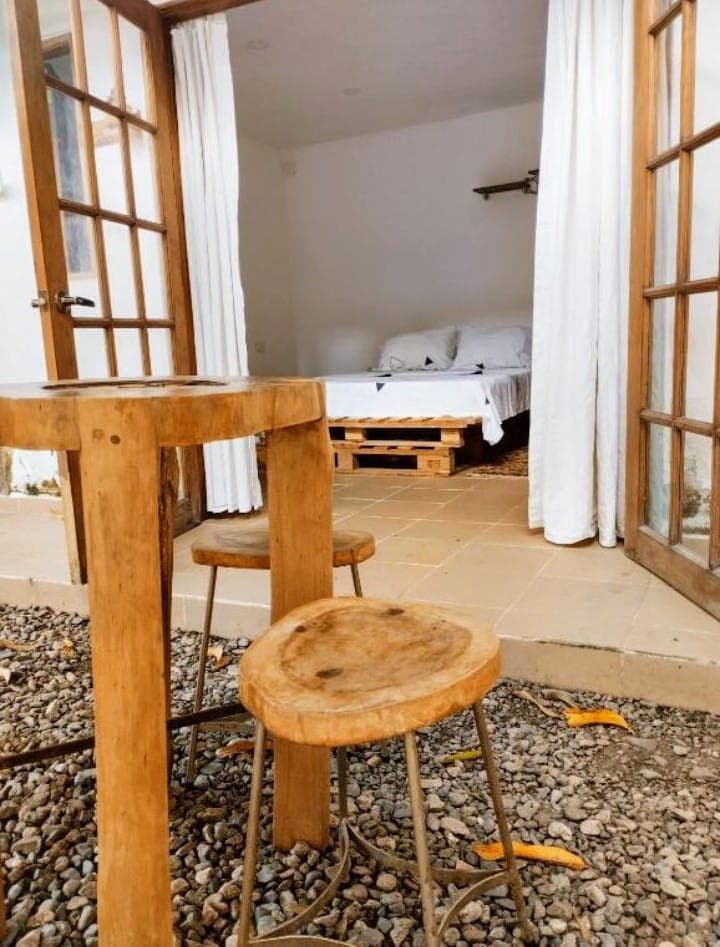 Habitación pequeña para pareja, con baño privado, aire acondicionado y hermosa vista hacia el mar. tendrás acceso a toda nuestra zona social. Perfecto espacio para disfrutar de unas vacaciones con tu pareja contagiándote de la buena energía de casa Babel, un lugar de hermosos atardeceres. Couple room with private bathroom, AC and a fantastic view to the sea. You can enjoy about all our common areas in the hotel. (Pool, big hammock, bar, relaxing living room and rooftop)